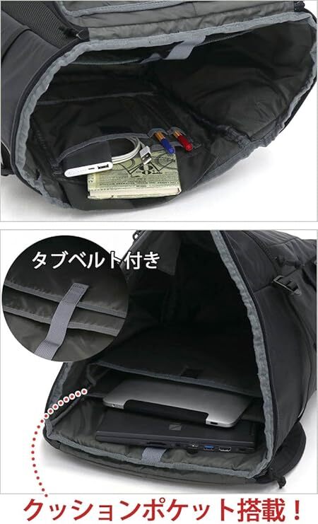 【豊富な収納スペース】メインコンパートメントに加えフロント・トップにもポケットがあり、サイドにはドリンク等を入れるメッシュポケットも装備されています。メインコンパートメント内もノートPCやタブレット収納や、小物整理に便利な2層に分かれたマルチスリーブが付いているためバッグ内も煩雑になりません。