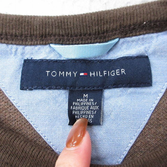 【商品名】 L★古着 トミーヒルフィガー 半袖 ブランド Tシャツ メンズ ワンポイントロゴ 鹿の子 コットン クルーネック 茶 リンガー