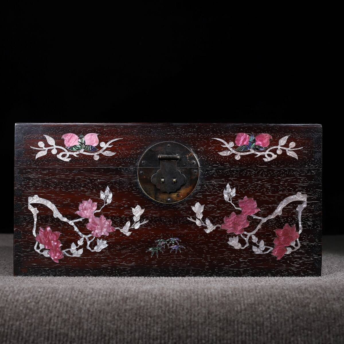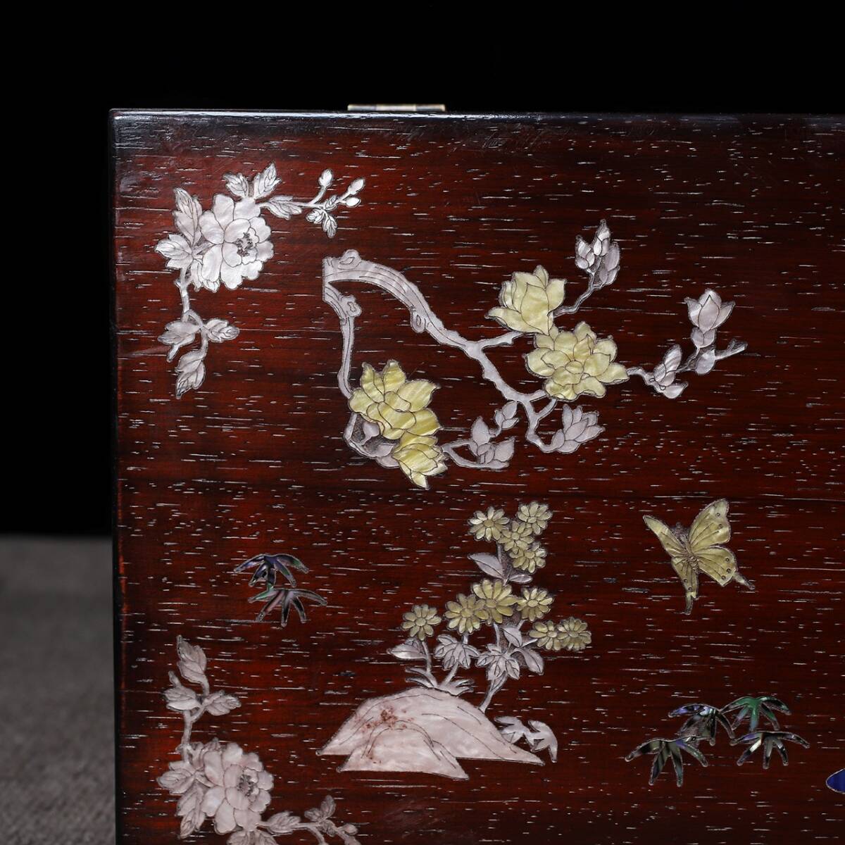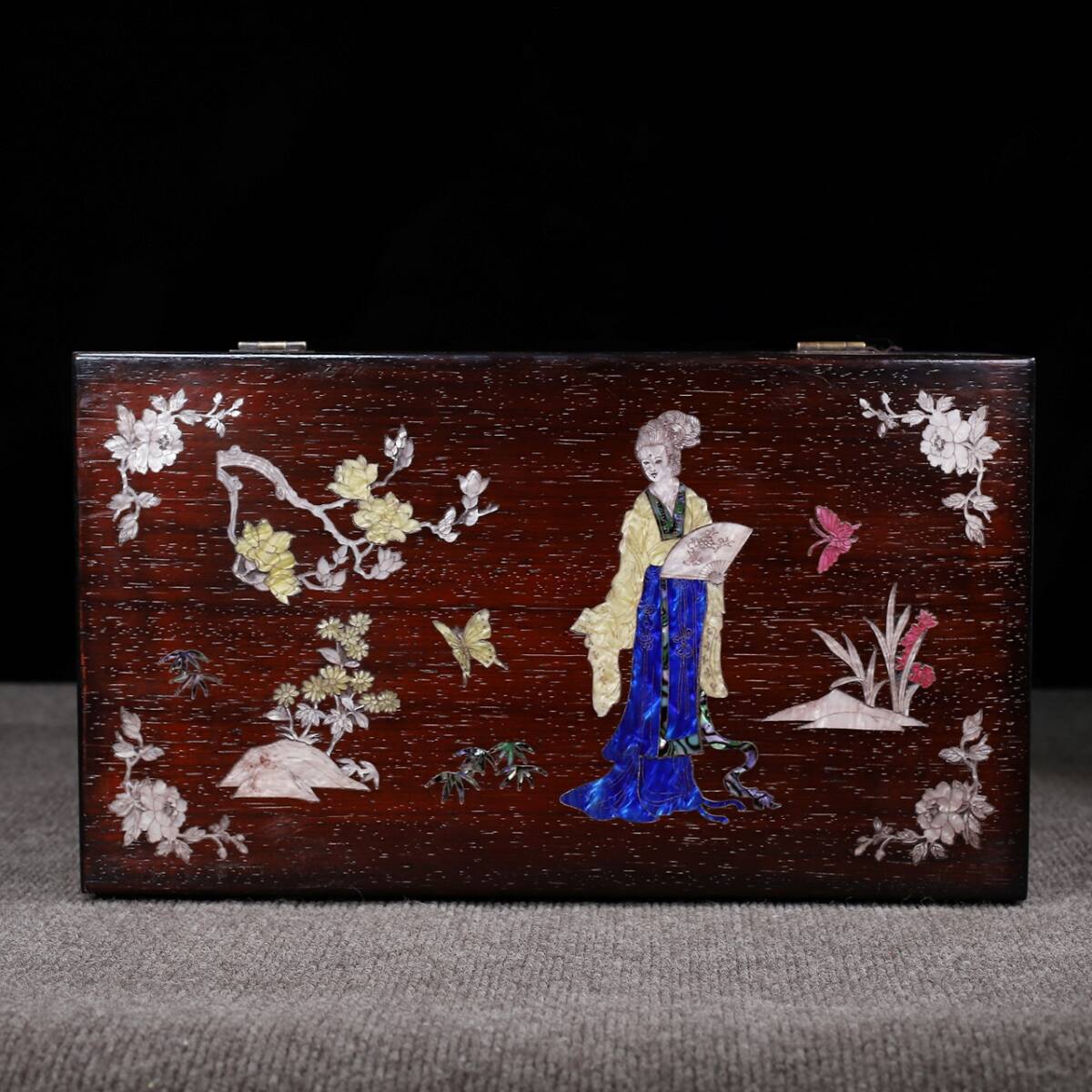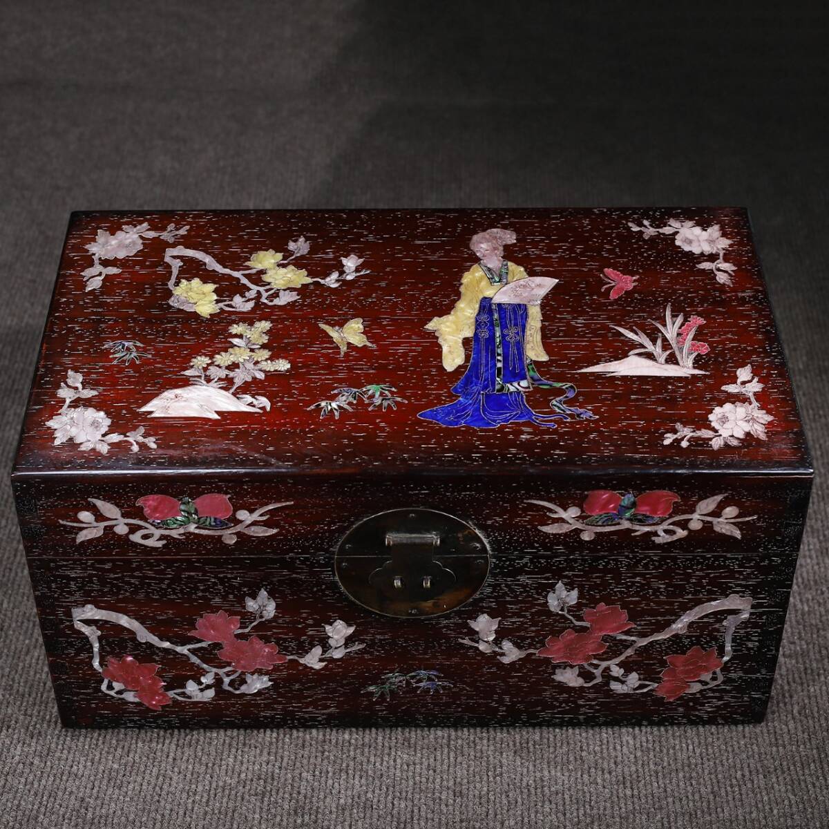 唐物 清 小葉紫檀 モザイク貝殼 仕女圖 首飾箱子 木製 極細工 中国古玩 骨董品 古美味 D68