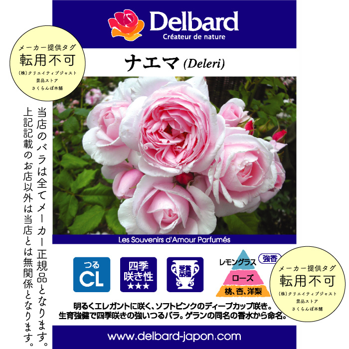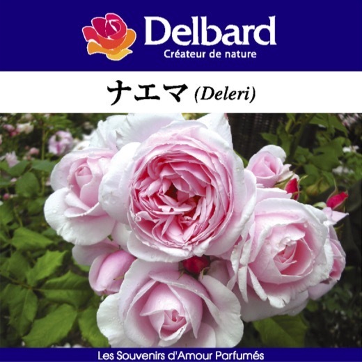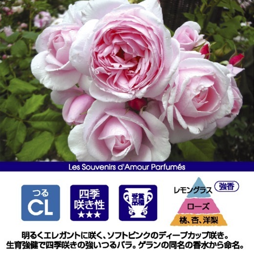 明るくエレガントなソフトピンクのディープカップ咲き。強健でシュートの発生が旺盛なつるバラ。四季咲き性も非常に強く、しっかりと成長しながら繰り返し開花も楽しませてくれる。大輪のスプレー咲きで、次々と開花し鑑賞期間が長い。特筆すべきは香りで、シトロネール(レモングラス)、ローズとフルーツの芳醇な香りは誰もがうっとりする。庭ではアーチやバーゴラ、壁面などに自在に仕立てることが出来るほか、大きめの鉢に植込み、強めの剪定で鉢栽培もお勧め。ゲランの限定香水の名から命名。2006年ぎふ国際ローズコンテストで銀賞とベストフレグランス賞を受賞。