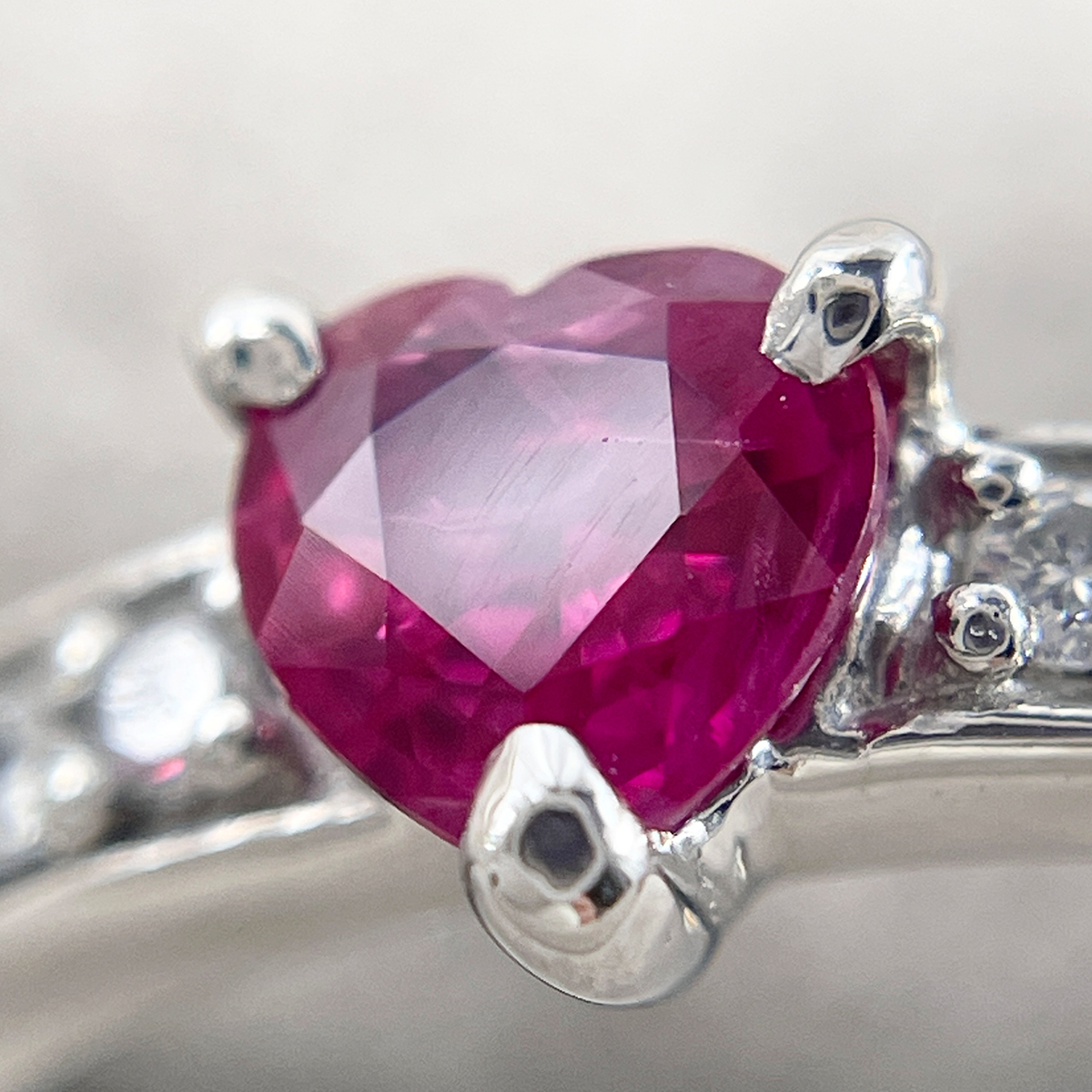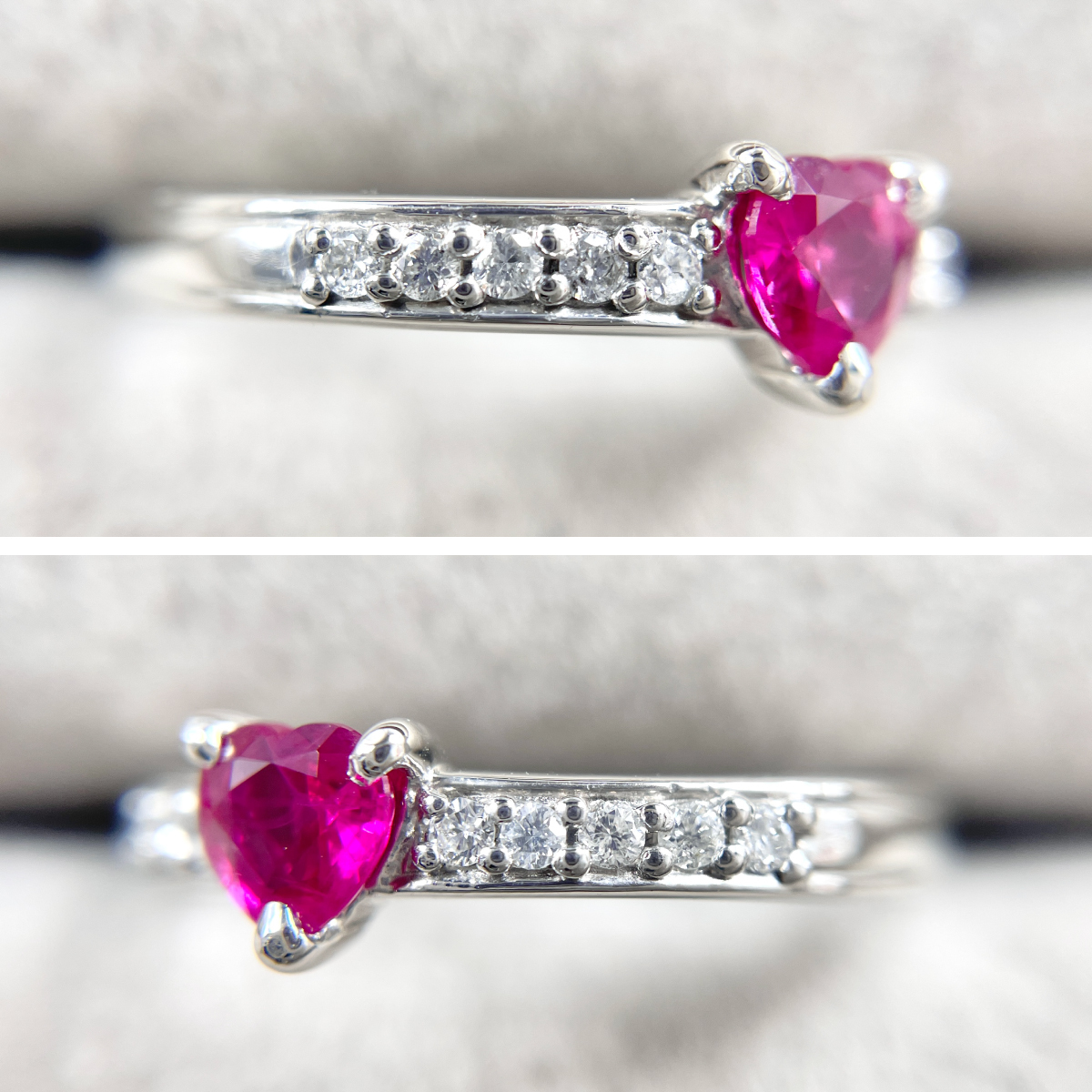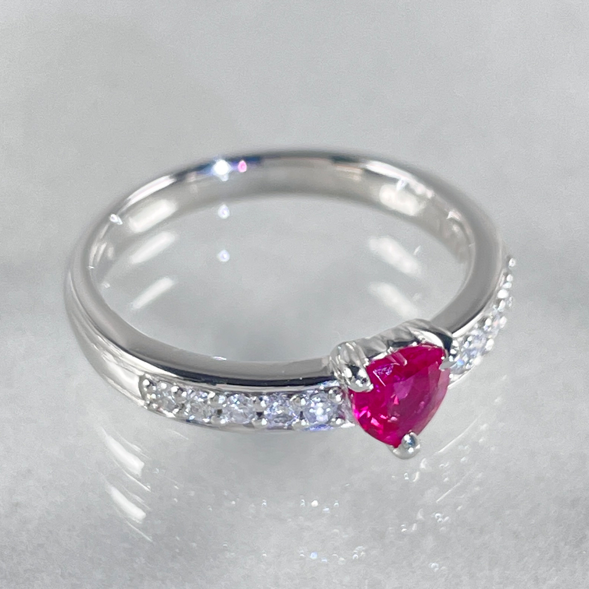 深みのあるレッドが魅力的なハートシェイプカットルビーが主役のリング。