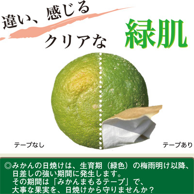 | ・みかん、中晩柑の日焼け防止 光を反射する白いラミネート加工を施したクラフト紙に、天然ゴム系の粘着剤を塗布したテープです。 柑橘系の果実に直接貼り付けることで、太陽光と温度上昇を防ぎ、日焼けによる白化・黄化を防止します。 食品衛生法による規格試験(厚生省告示第370号 材質試験・溶出試験)に適合しておりますので、安心してお使いいただけます。 十分防除の上、水分や油分を取り除いてからテープを貼り付けて下さい。 |