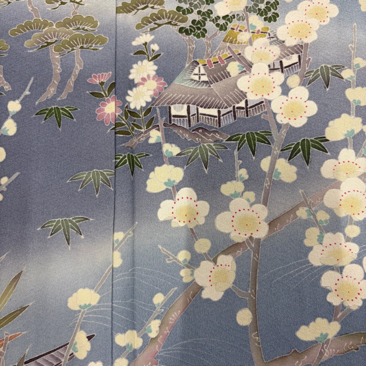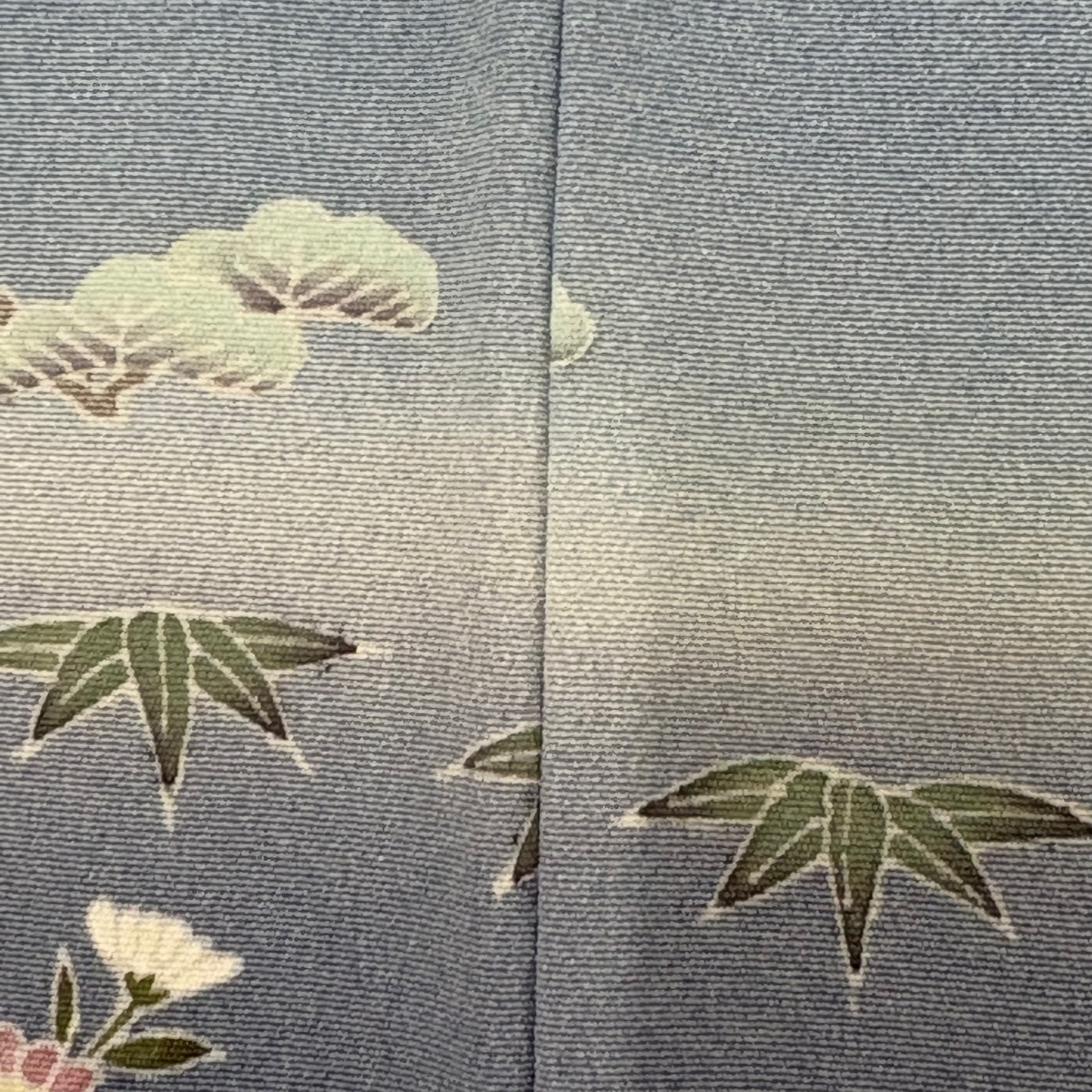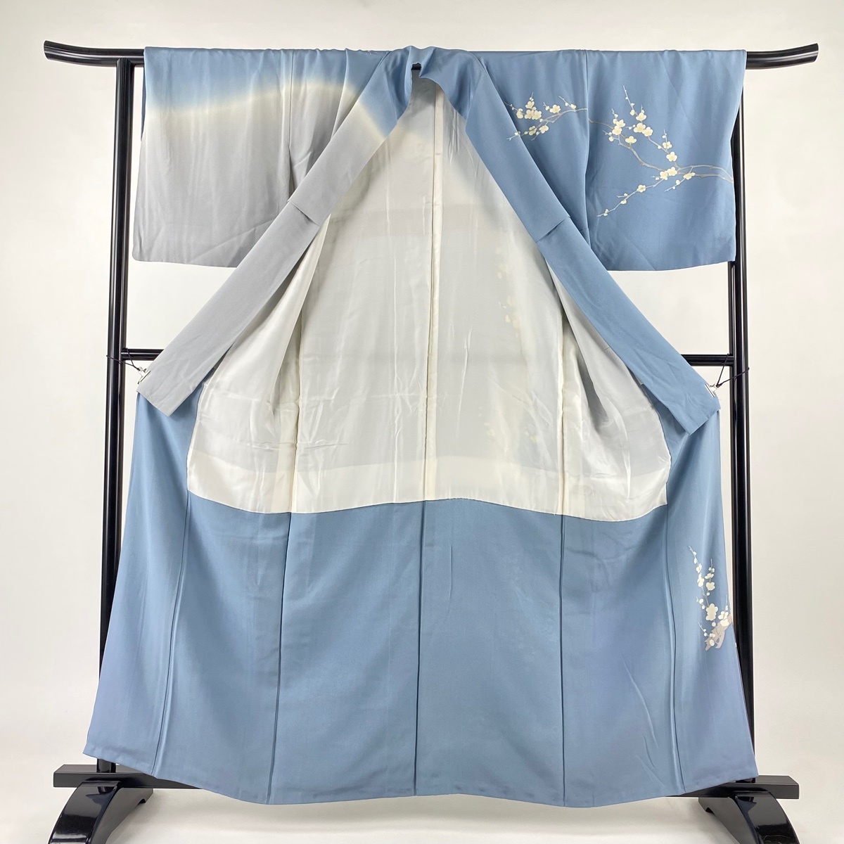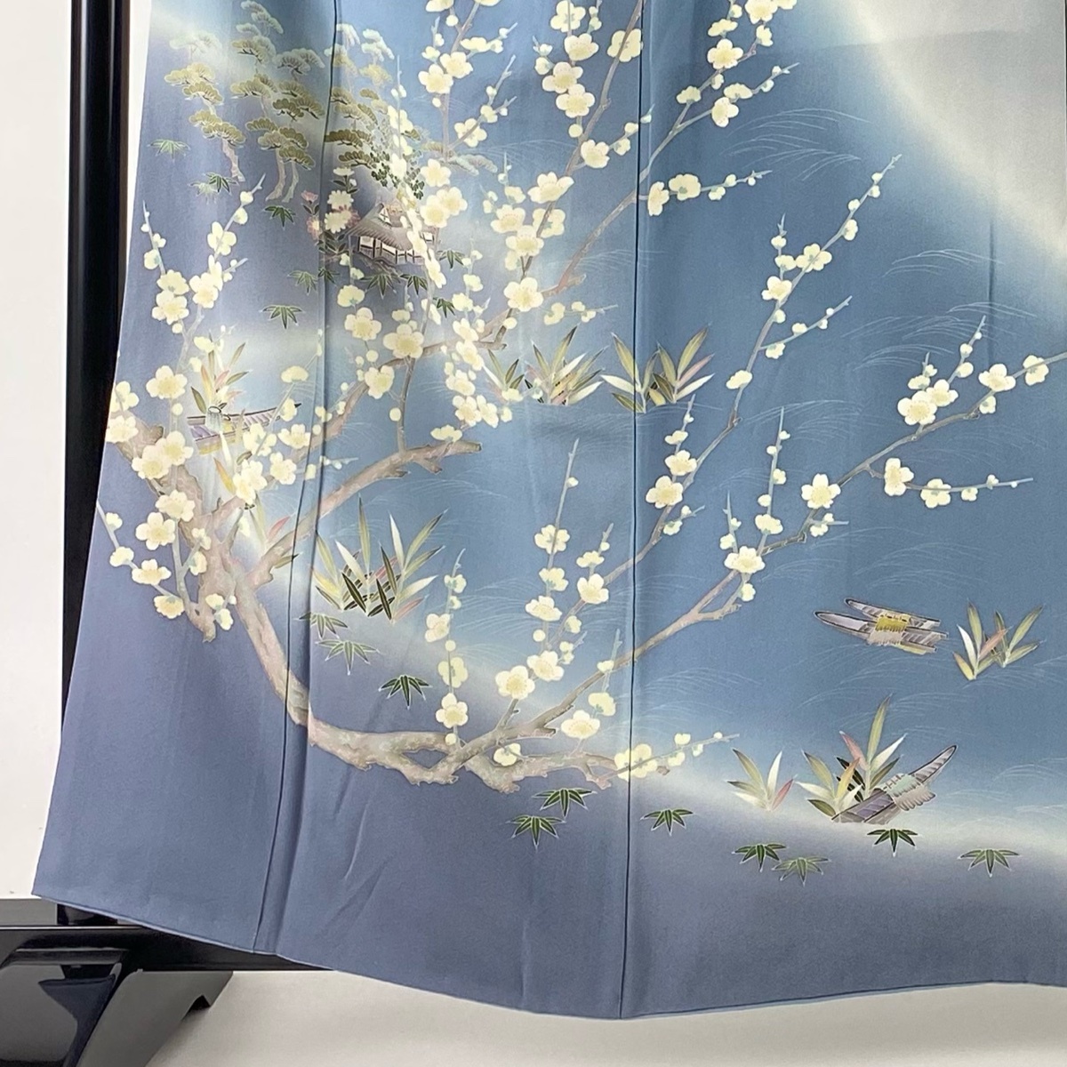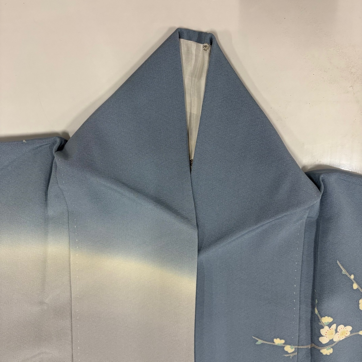 訪問着 秀品 落款 枝梅 松 ぼかし 青灰色 袷 身丈159 裄丈66.5 M 正絹 【中古】 |
