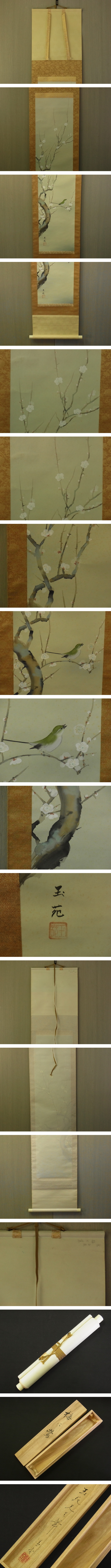 【模写】 t1843 蔵出 掛軸 玉苑 梅に鶯 絹本 共箱 花鳥 風景 日本画 骨董 古美術