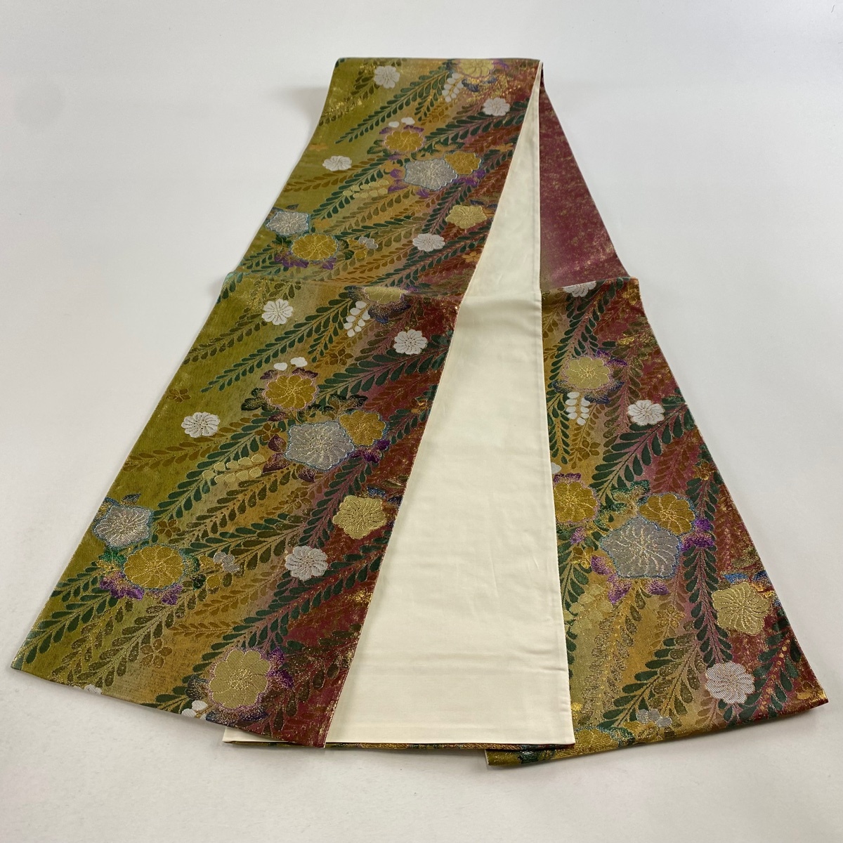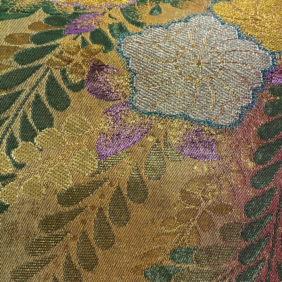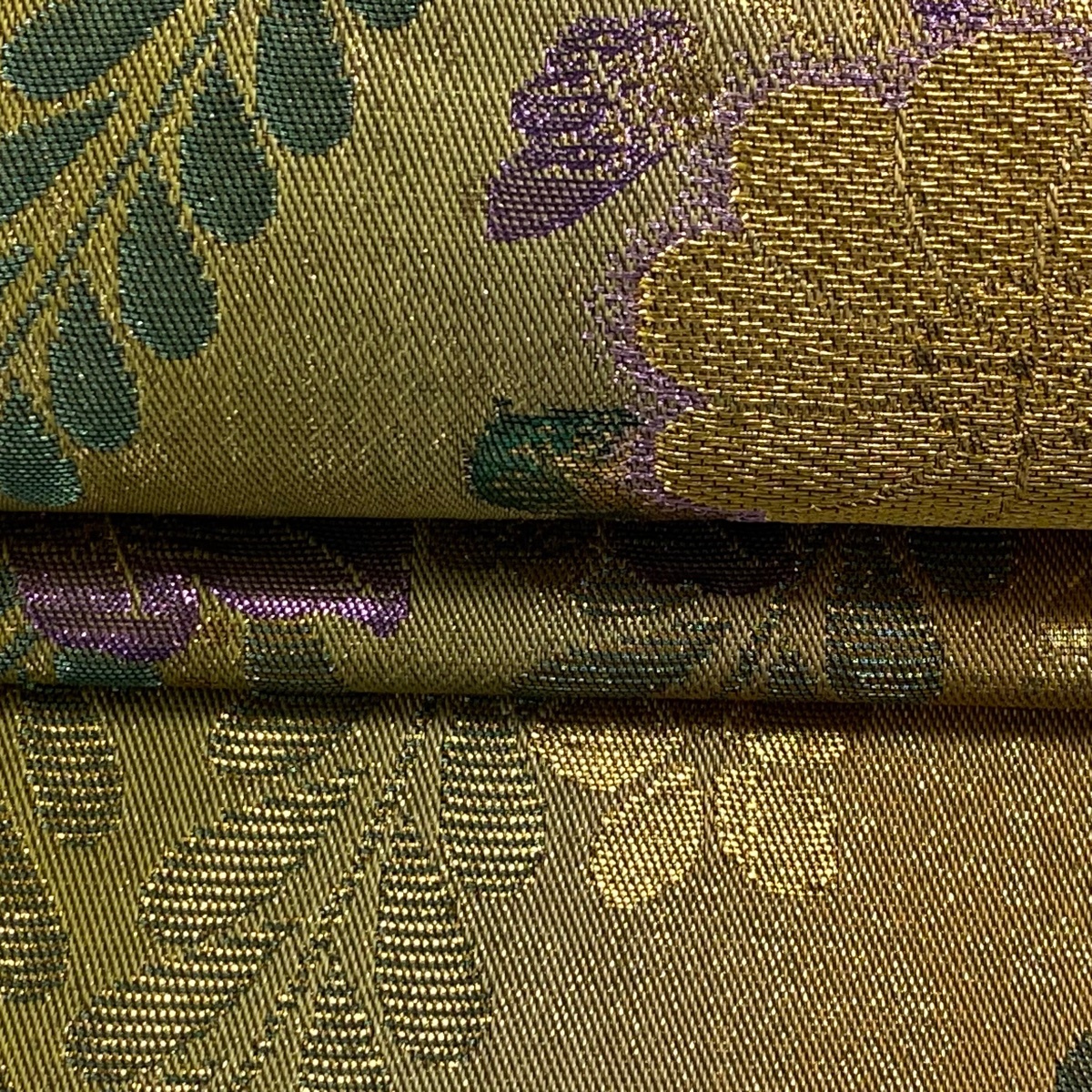 | 袋帯 美品 秀品 振袖向き 辻が花柄 藤 金銀糸 箔 金色 六通 正絹 【中古】 |