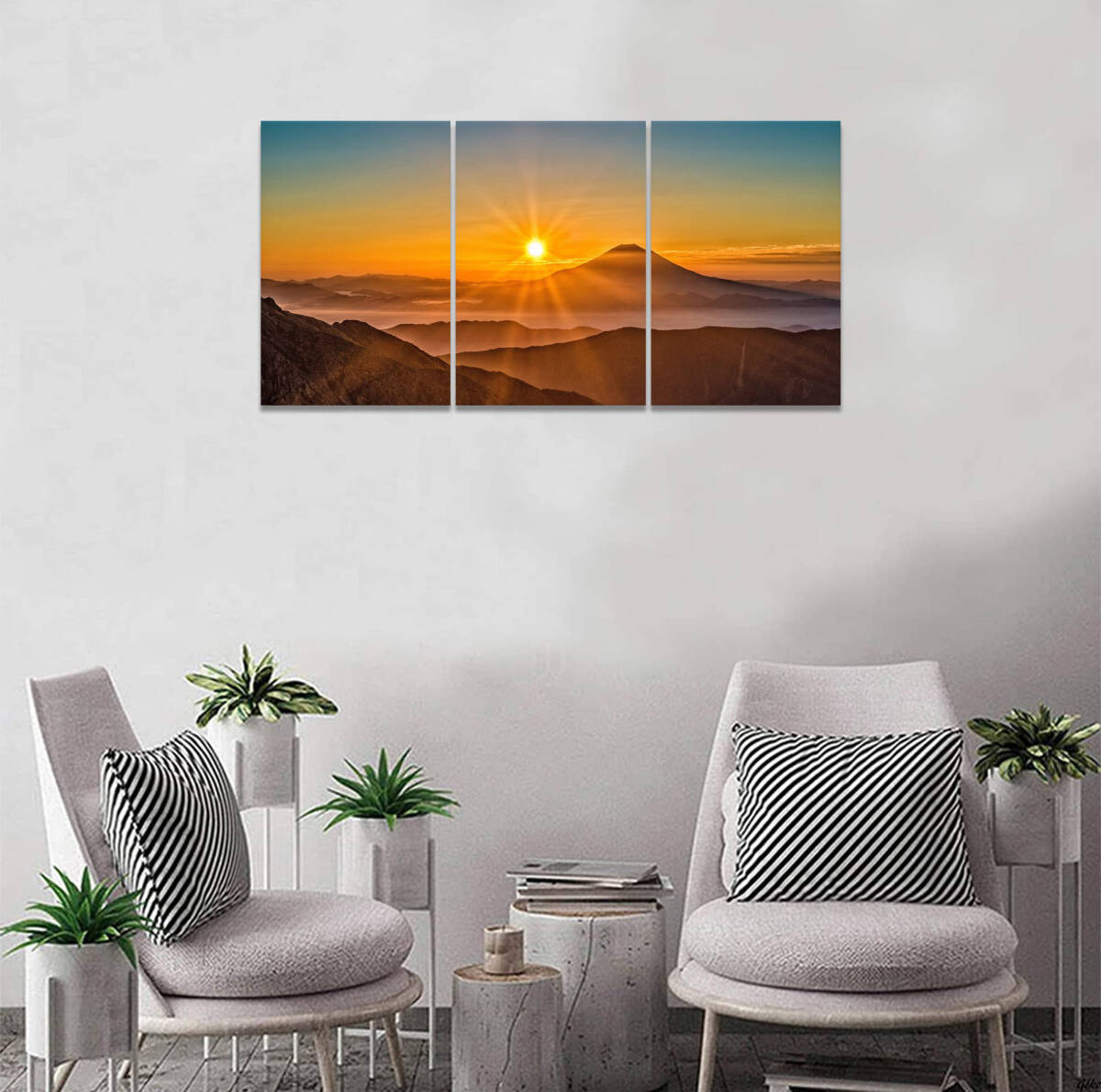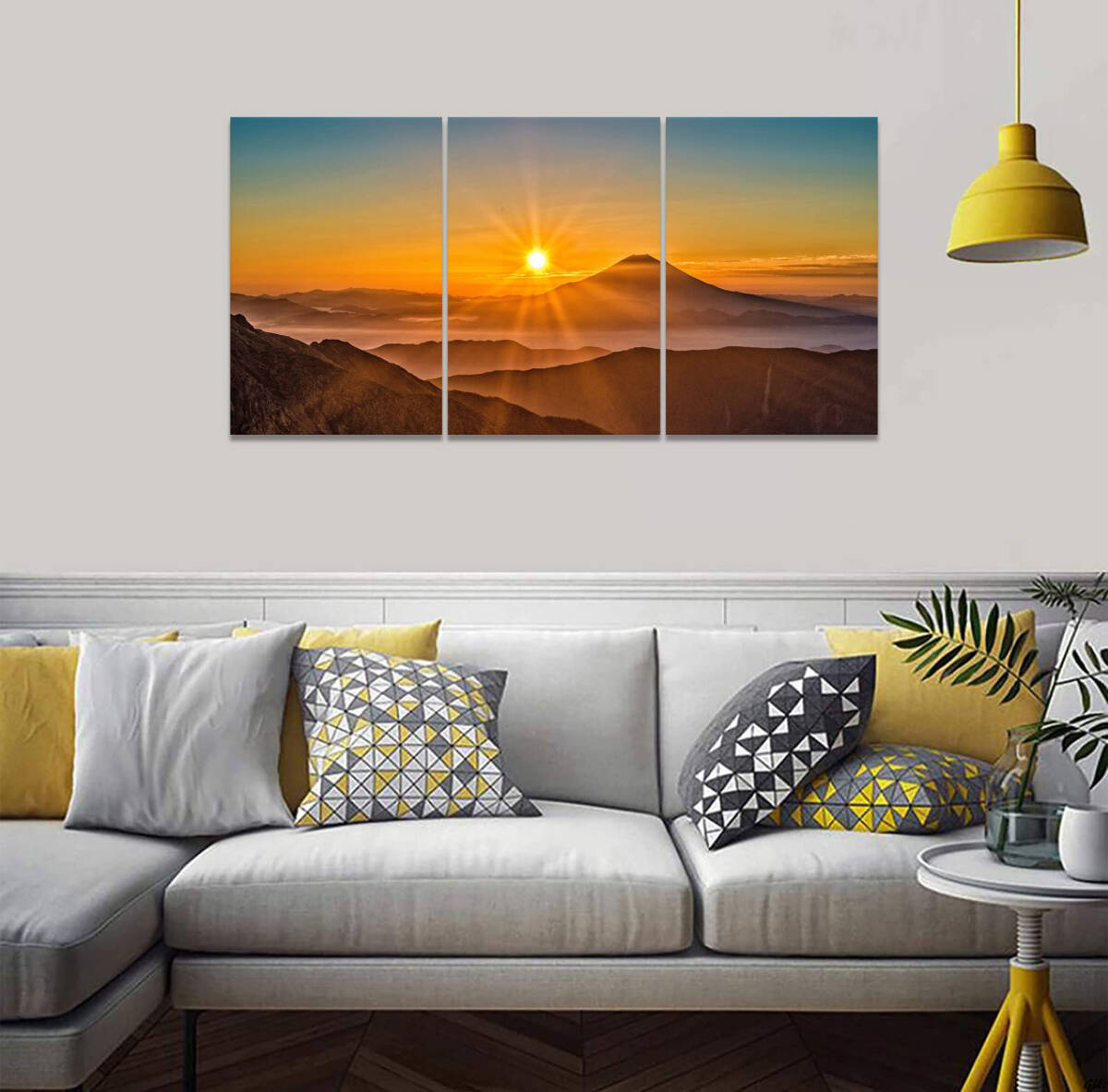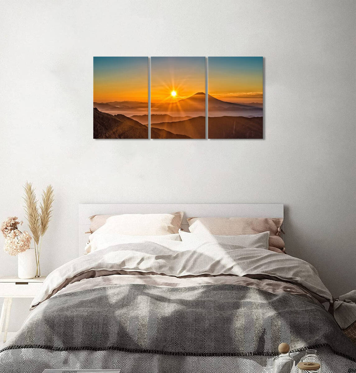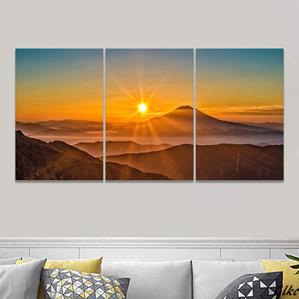 自然の雄大さを感じられる山の風景と、朝日が昇る神秘的な瞬間を描いた3枚組のアートパネル。