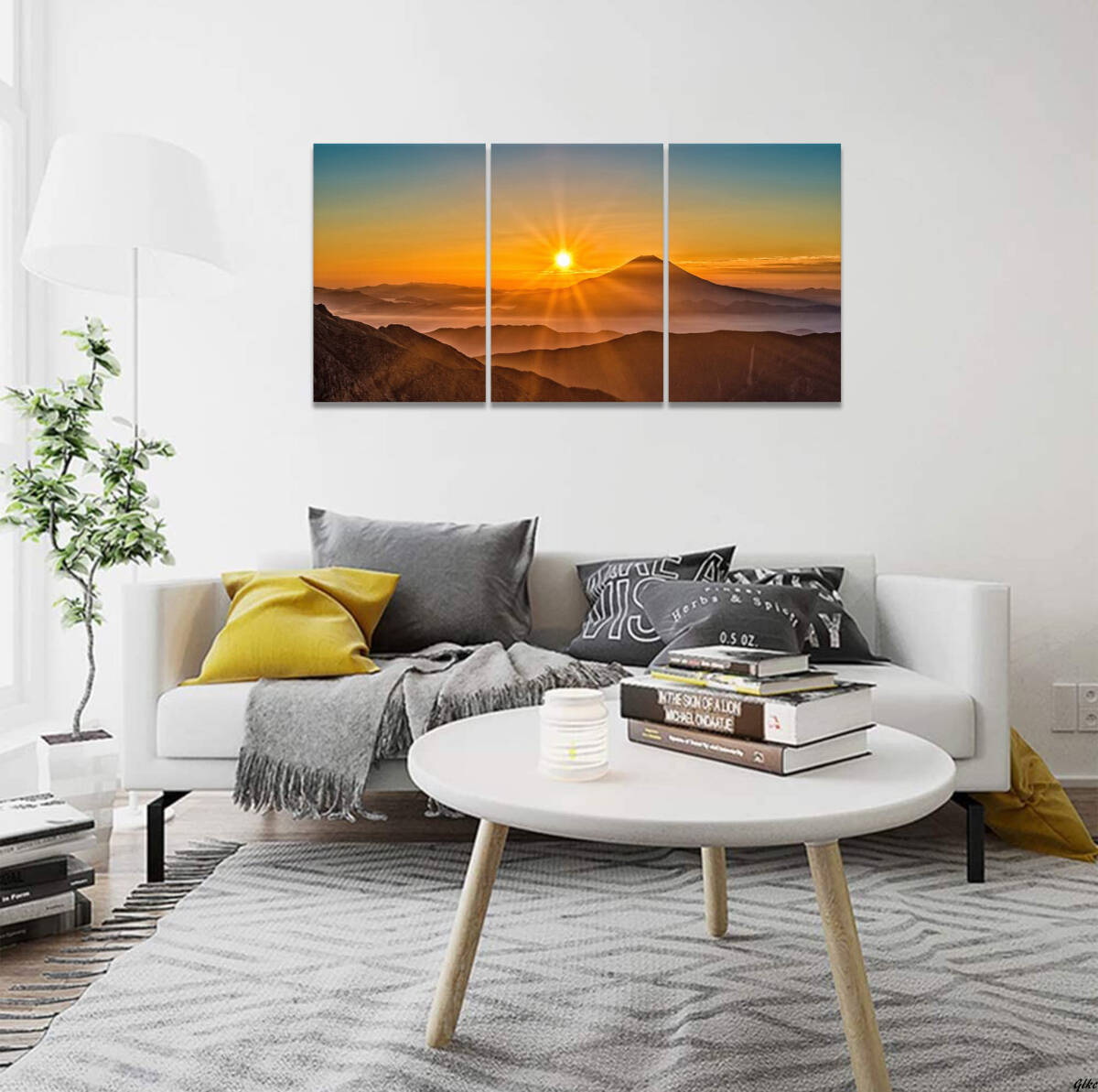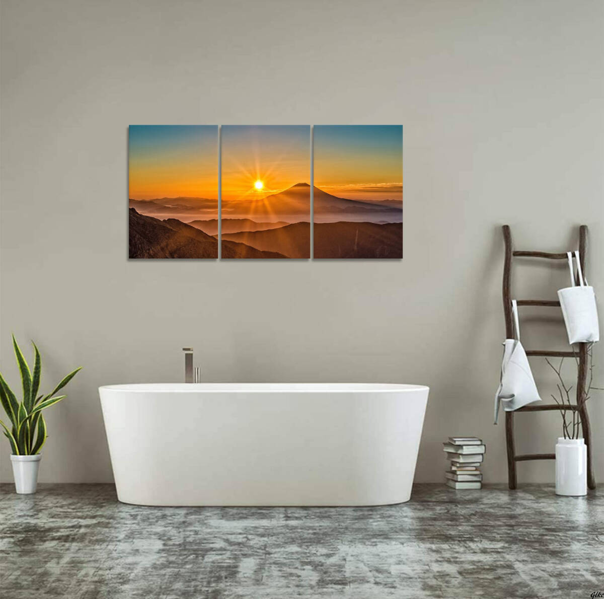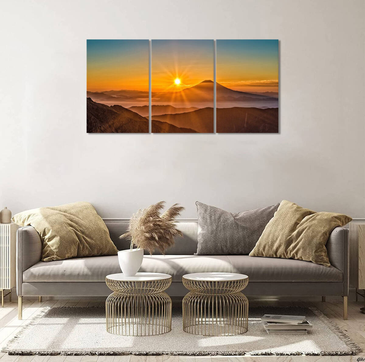 自然の雄大さを感じられる山の風景と、朝日が昇る神秘的な瞬間を描いた3枚組のアートパネル。