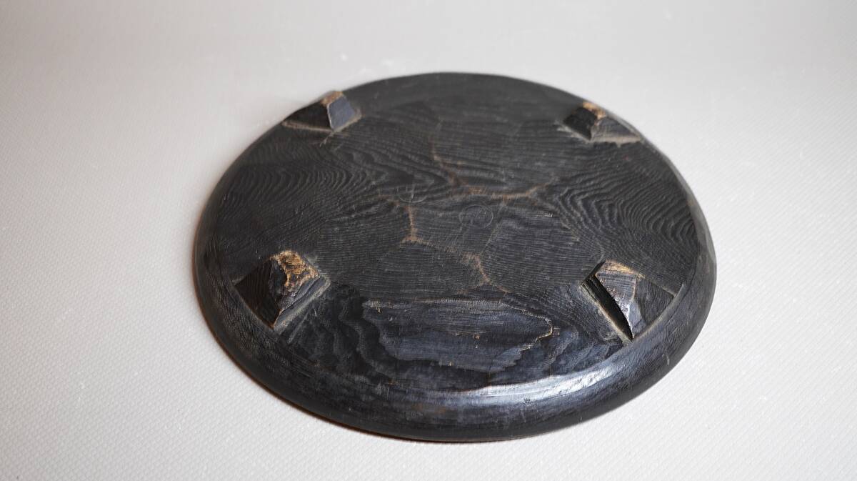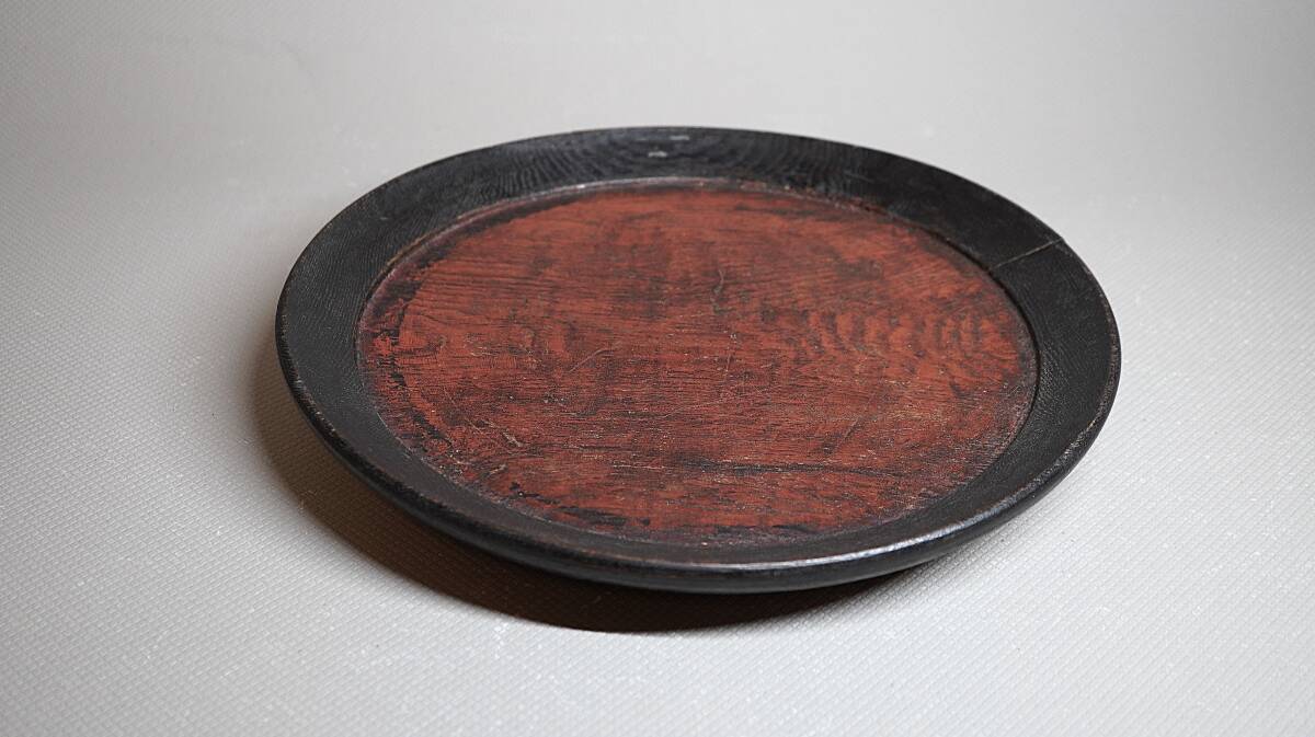 見込みには弁柄漆が、口縁と裏面は黒漆が薄く塗られており、経年の使用で栗材の木目が表れています。