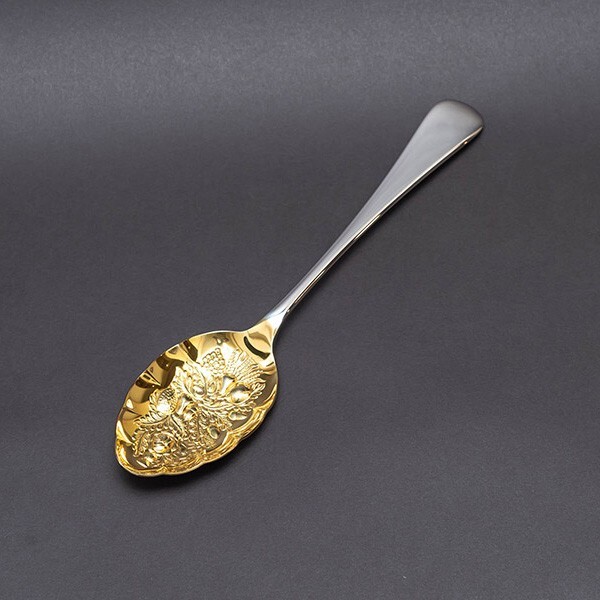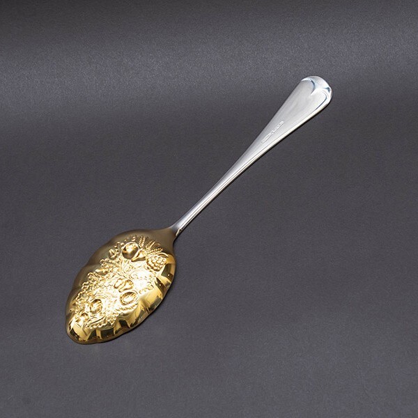 イギリスの老舗シルバーウェアブランド、マッピン&ウェッブのベリースプーン。 ベリースプーンとは、ベリー類やデザートのサービングに使われるスプーンのこと。ボウル部分にブドウやベリーなどのフルーツのエンボスが施されています。全体に"マッピンプレート"と呼ばれる通常の2~3倍の厚みのある高品質な銀メッキが施されています(ゴールド部分は金のマッピンプレート)。 ■サイズ 長さ230mm ■付属品 なし ■状態 A(美品):使用感のない、非常に状態の良いお品物です。 |