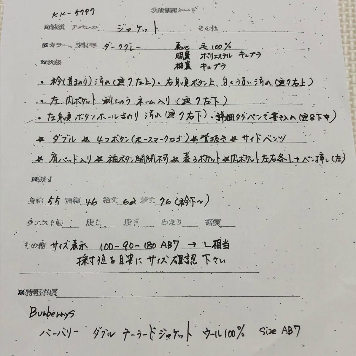 首回り汚れ、右身頃汚れ、内側ネーム、左身頃ボタンホールまわり汚れ、タグ書き込み※写真7