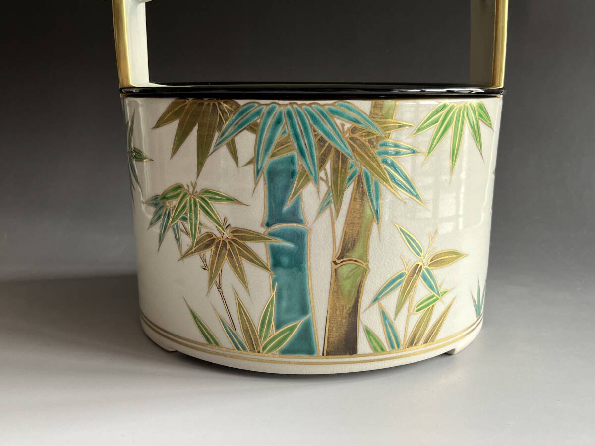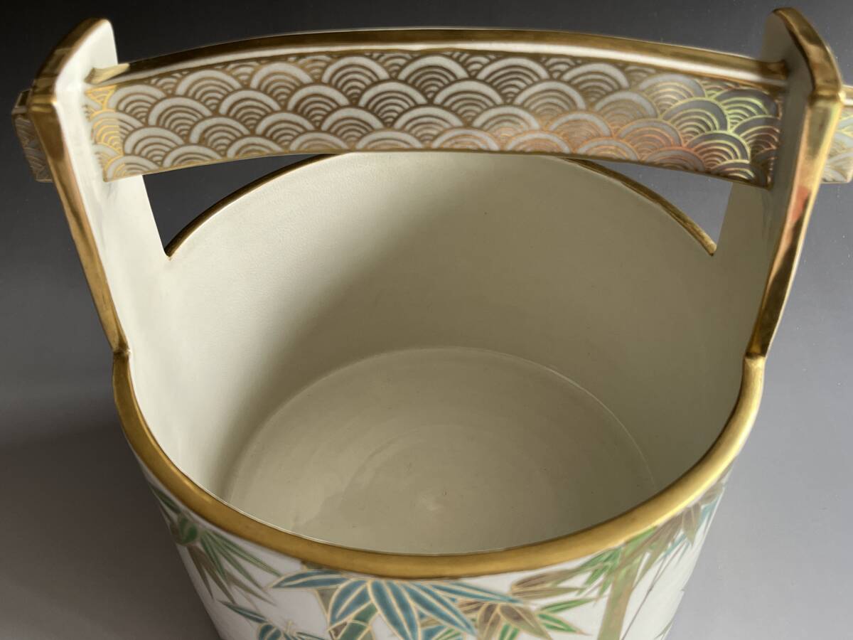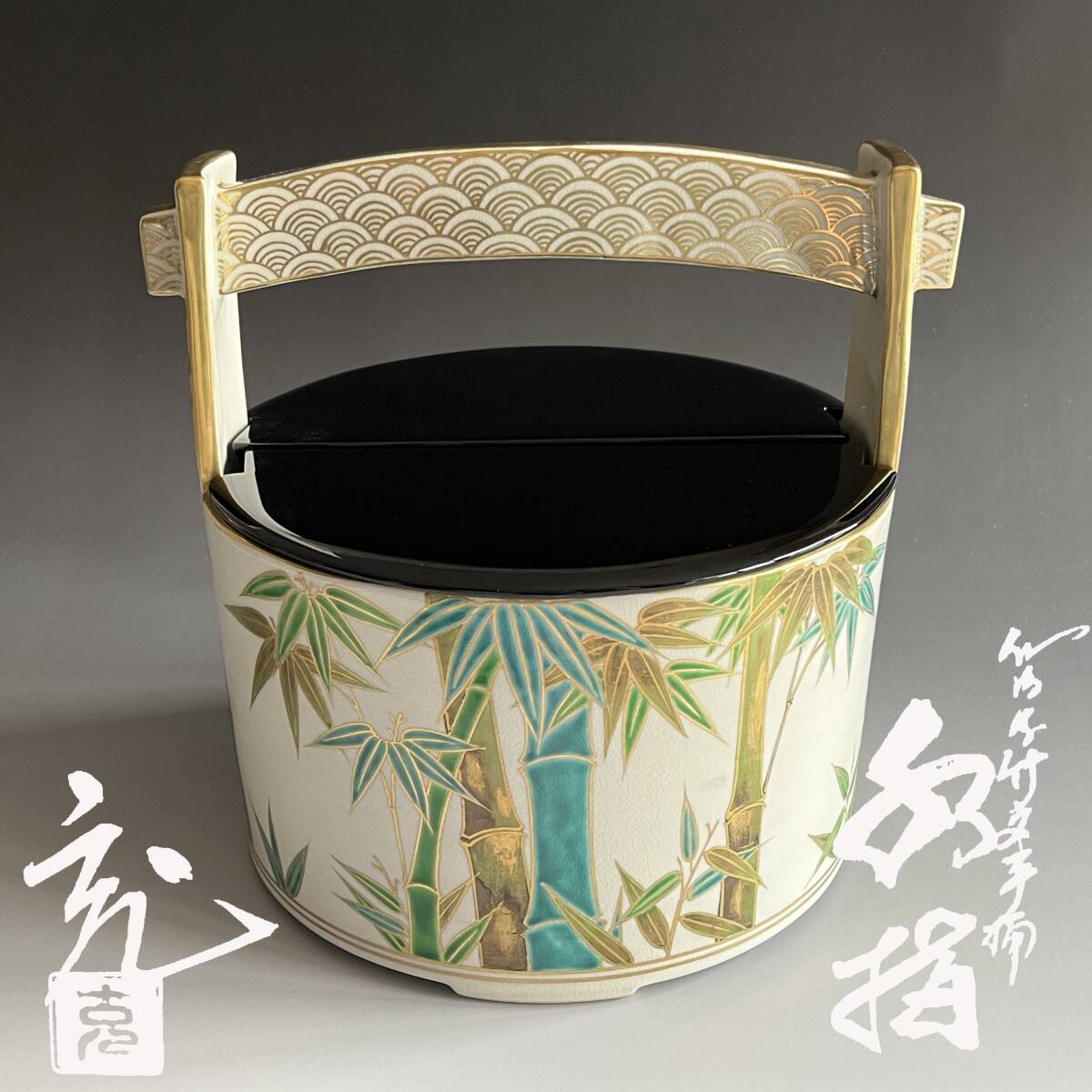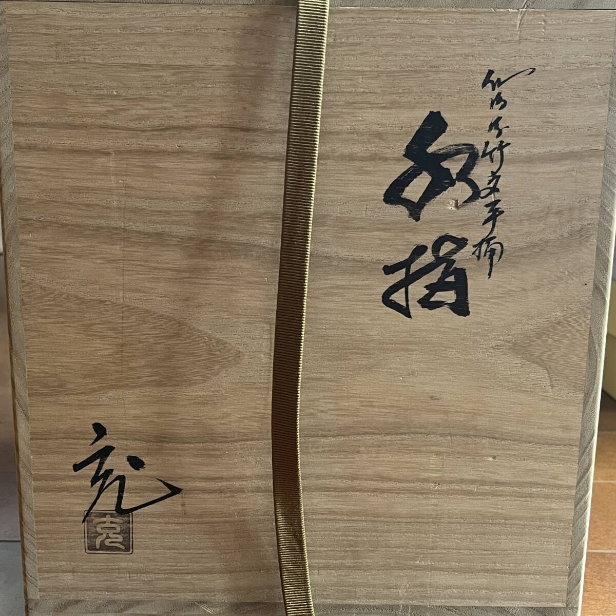 【サイズ】 直径 約23cm 高さ 約24cm 【状態】 目立った傷や汚れはございませんが、あくまで古物となります。 【付属品】 共箱 【商品説明】 手塚充 竹文手桶 水指