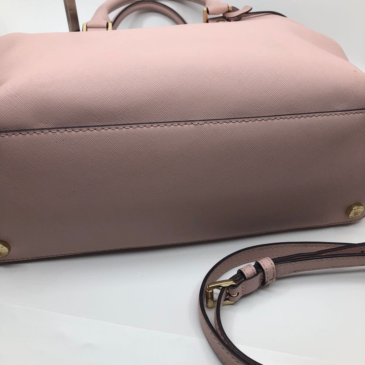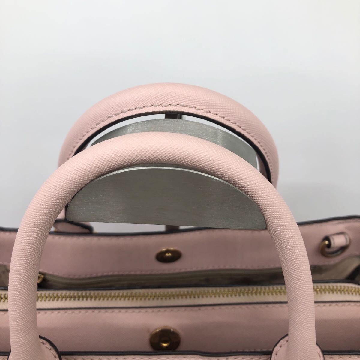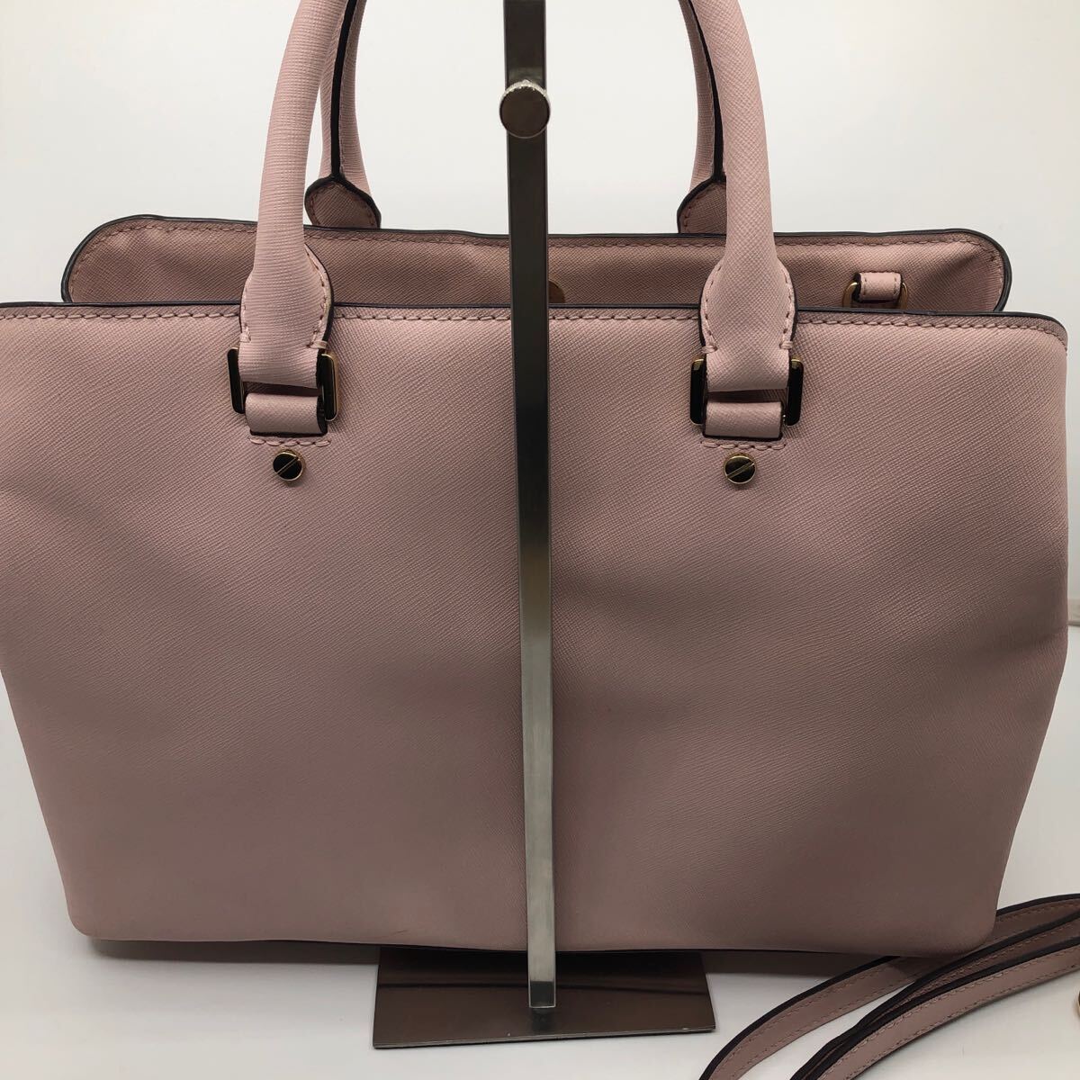 ピンクのハンドバッグ、ショルダーストラップ付きで使い勝手が良い。