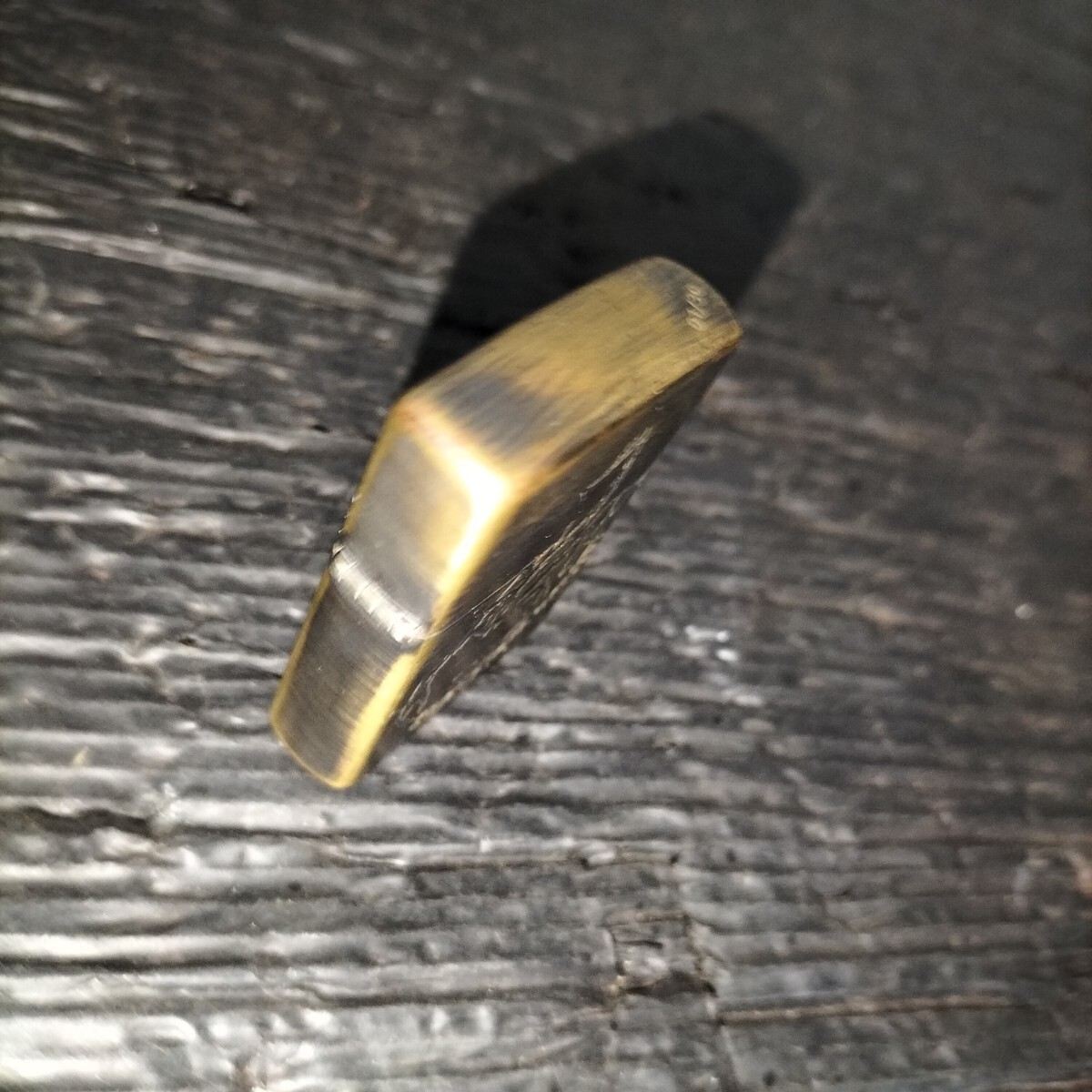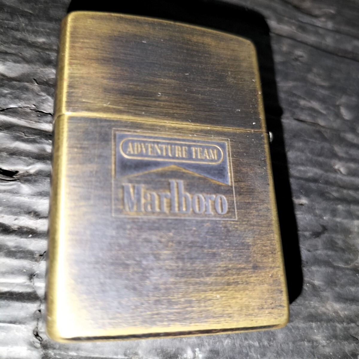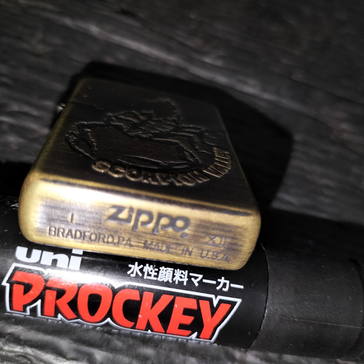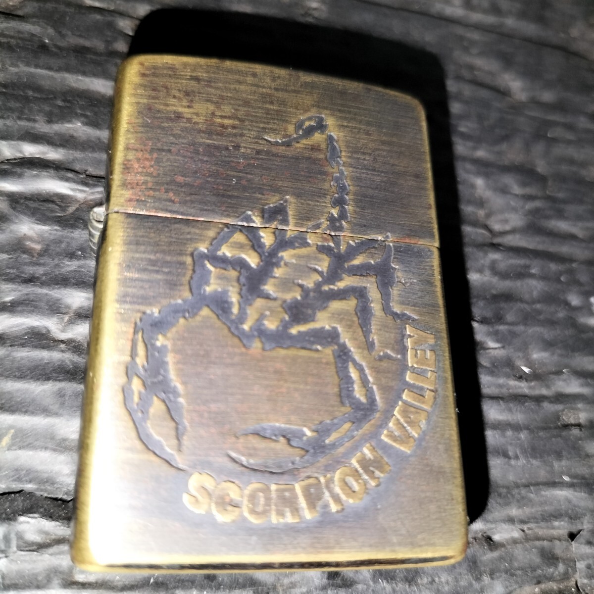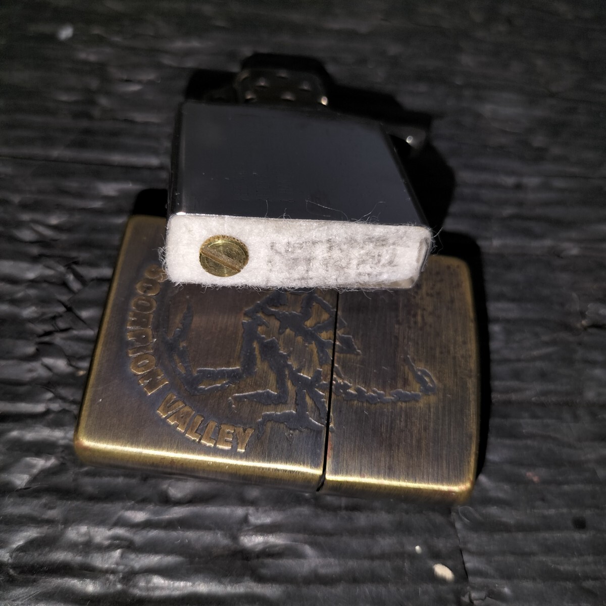 「過酷な環境下も探究心と生き抜く」のコンセプトはそのままに、リザードから一新されたスコーピオンバレーのデザイン。Zippo全体は真鍮プレートに覆われサテーナ加工が施されています。正面のキャップからボディに渡りグラフィカルにデザインされたスコーピオンが配置され、それを包み込むようにScorpionValleyの英文字のゴチック体、裏面中央にはブランドマークがエッチングで力強く彫り込まれています。そしてキャップ天面にはお洒落なサインを思わせる斜めに深く彫刻されたシリアルナンバー。この時期のマルボロブランドのアイテムにかける熱量は一種の特徴であり、マルボロユーザー達へブランドイメージを発信する情熱が感じられる逸品です。