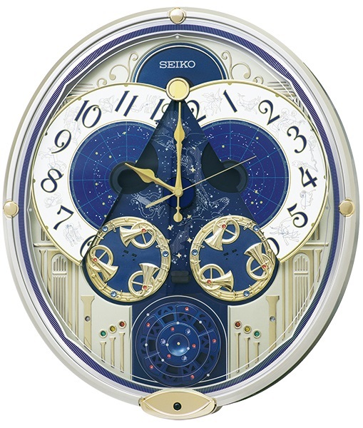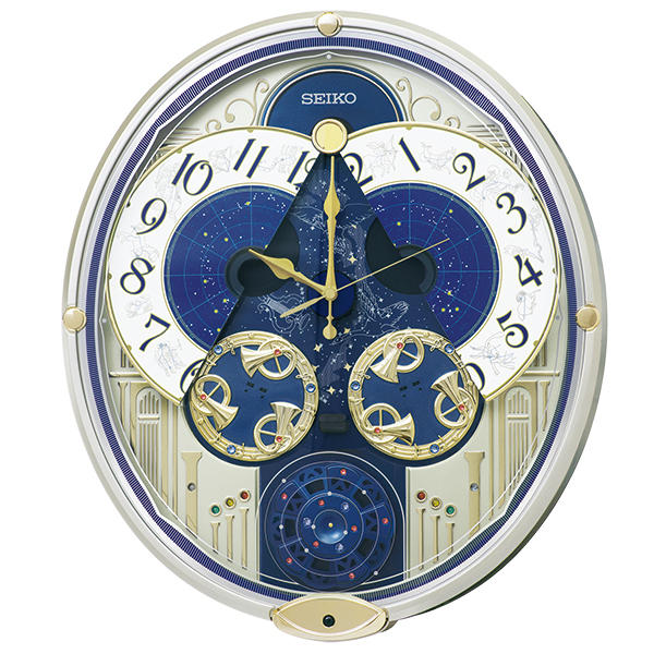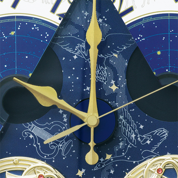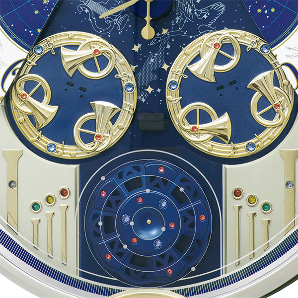 ①毎正時、オープニングの曲とともに文字板が左右に開き、中から現れたラッパの飾りがついたディスクが回転します。