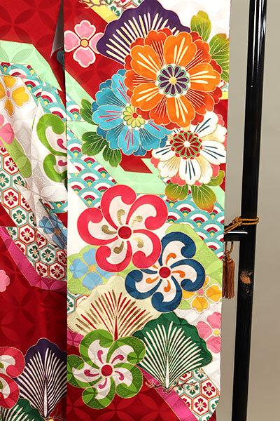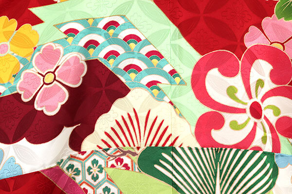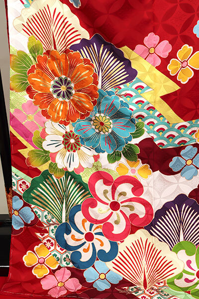 しっとりとした生地は、赤色でございます。 七宝花菱文の地紋入りでやや光沢感がございます。