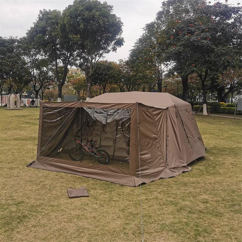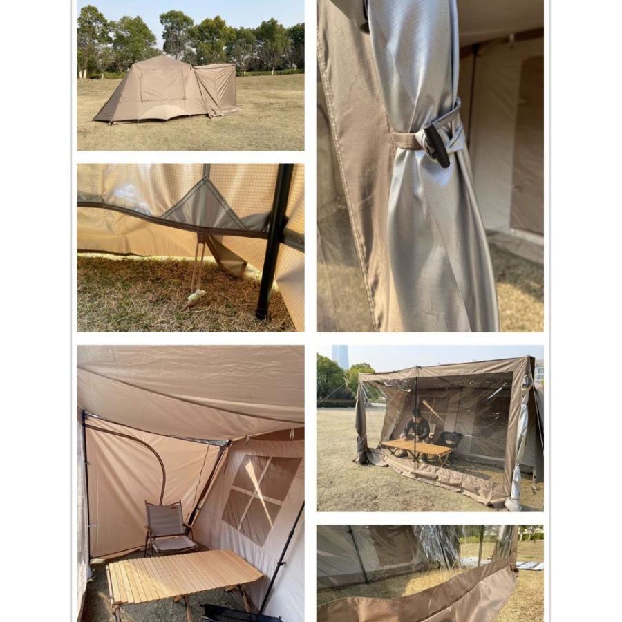 取付簡単 テントの前ホールを設営したら、3本のポールに拡張テントを掛けてテントの側面に結び付けで取付完了。