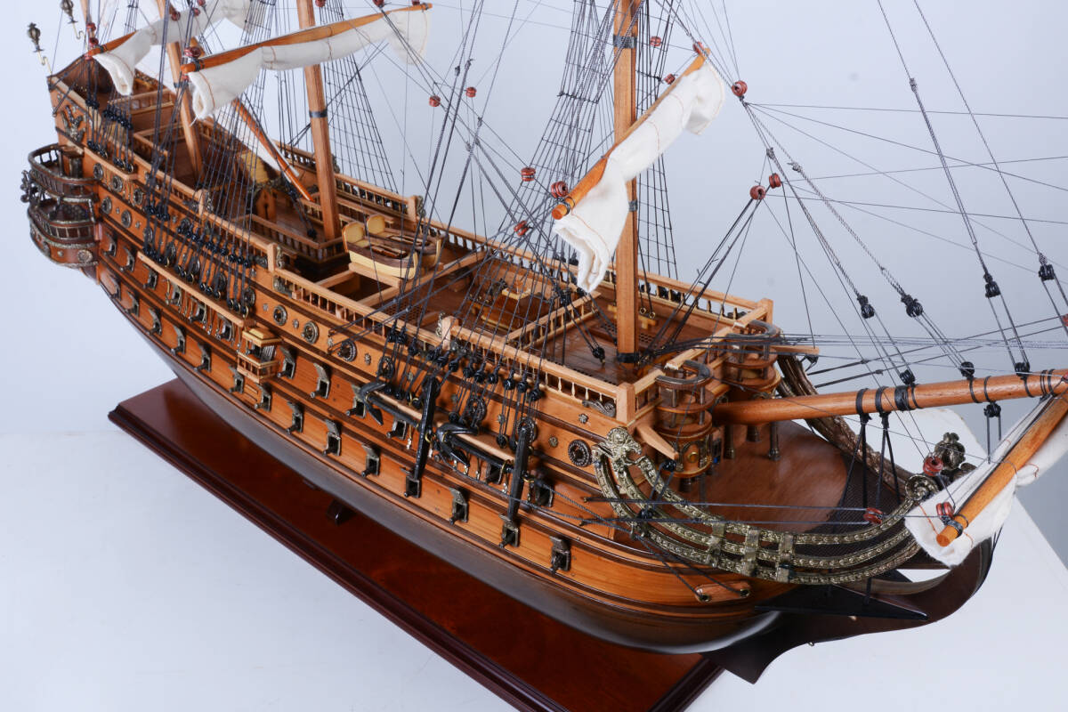 圧巻の全長約92cm、全高約83cmの大迫力。帆、索具、砲門、彫刻装飾など、細部にわたって精巧に手作業で仕上げられた逸品です。