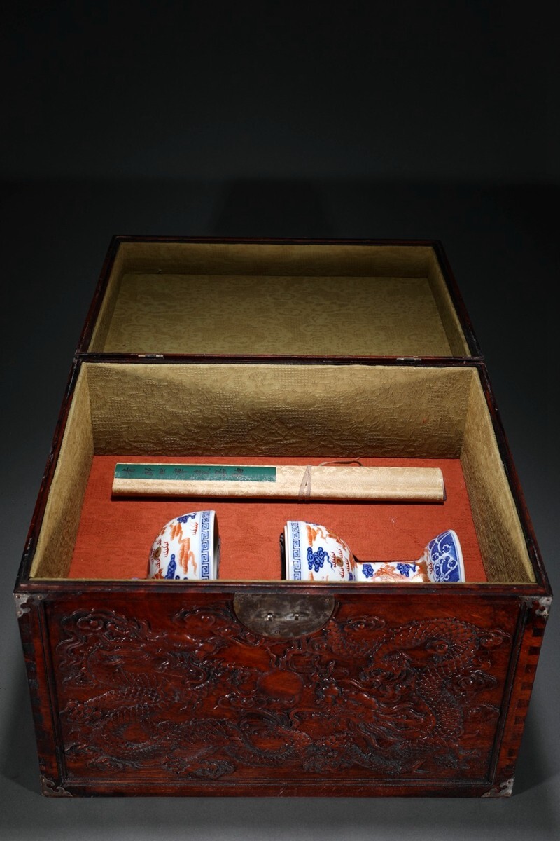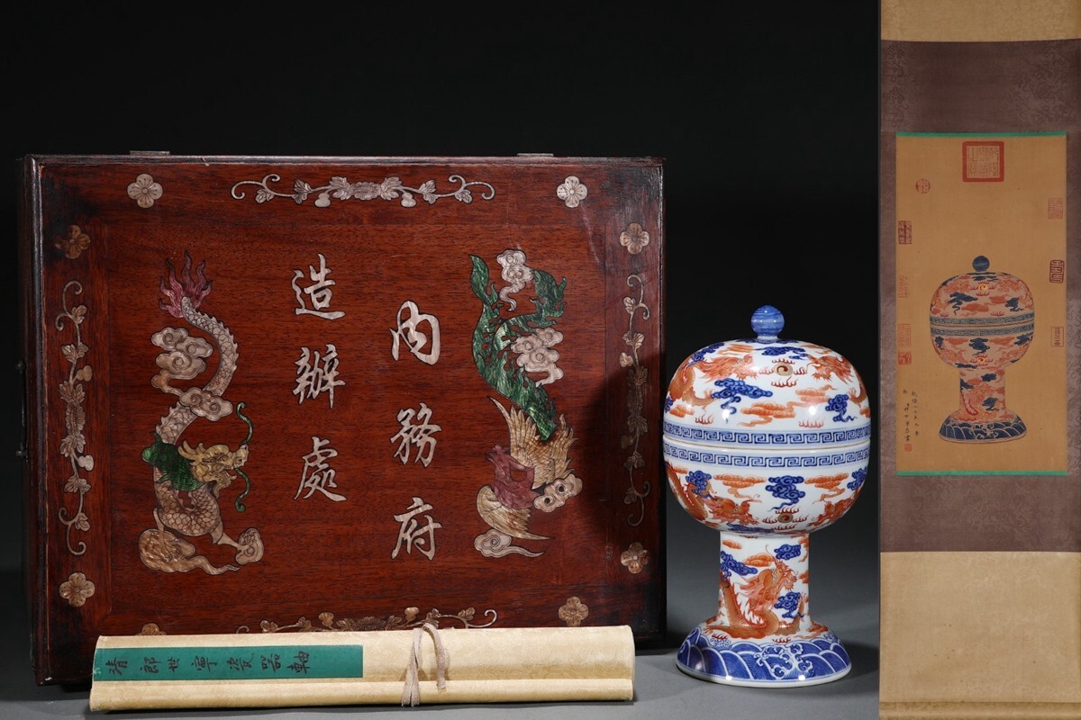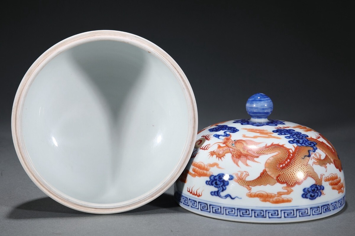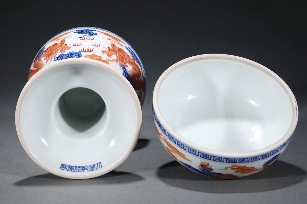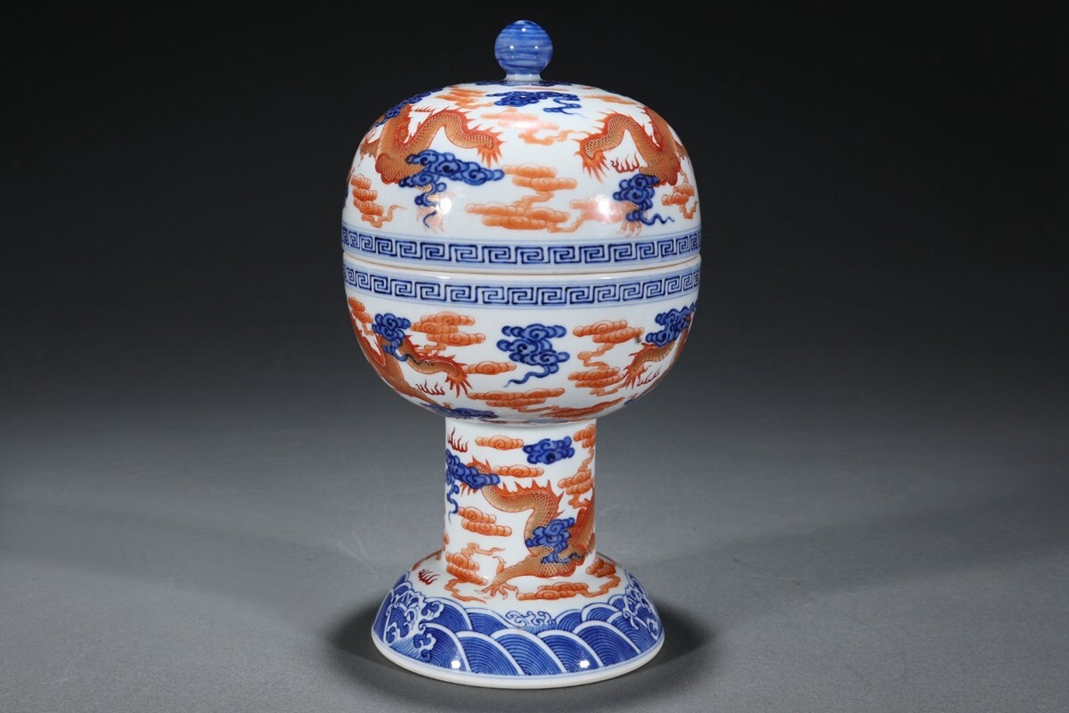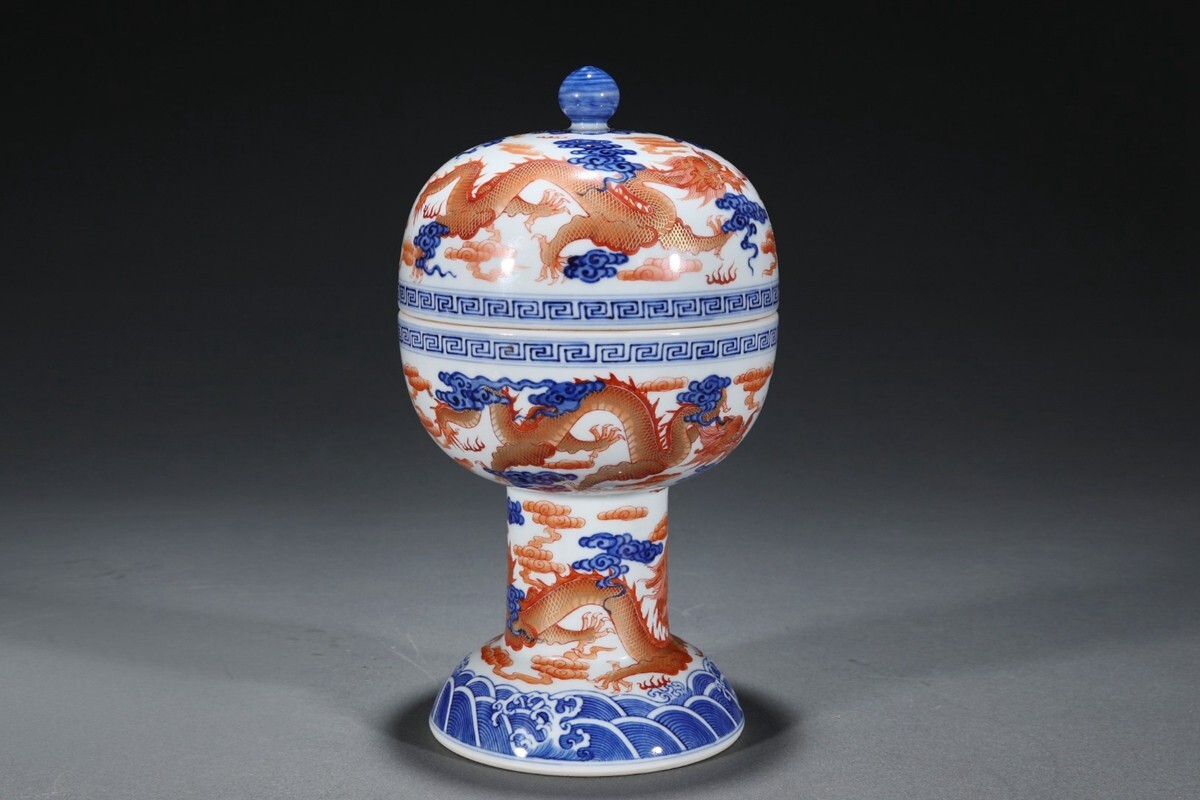 「清 乾隆年製 陶磁器 青花礬紅龍紋 豆」染付 置物 擺件 古賞物 中国古美術 旧蔵出