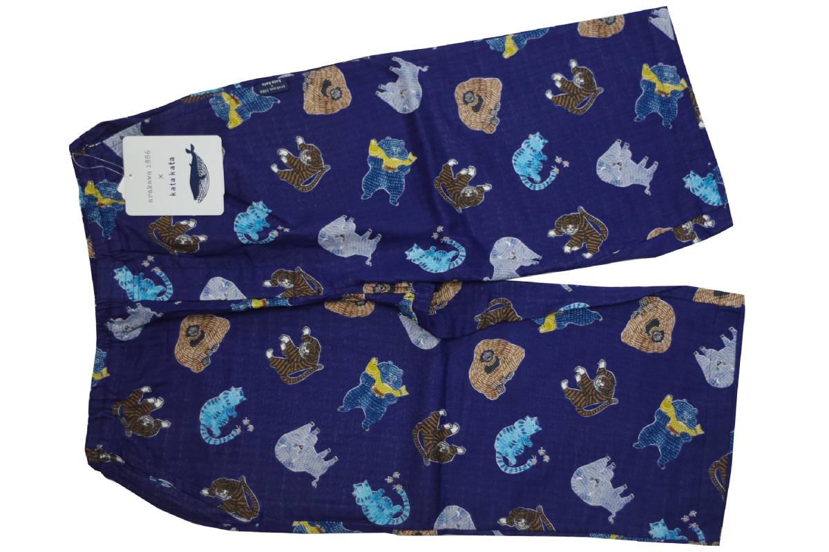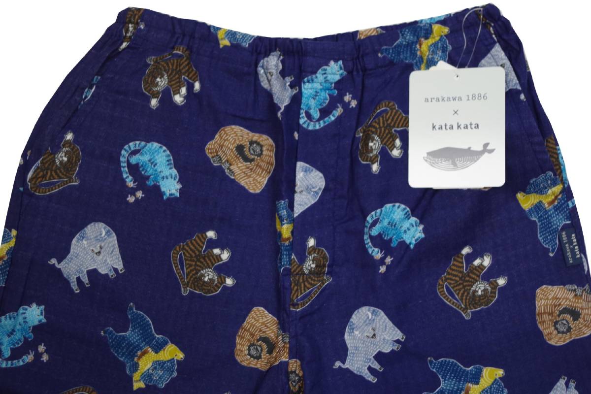 ■katakataの男性用、六分丈リラクシングパンツ(ホームウェア)新品です。サイズはM、ウエスト76-84cm、身長165-175cm。平置き実寸で総丈約65cm、股下約36cm。前開き。両サイド、右後ろポケット付き。綿100%ガーゼ素材、主に春・夏シーズンでお使いいただける生地感です。色はネイビー系。正規ライセンス会社扱い品。税込定価6,050円です。