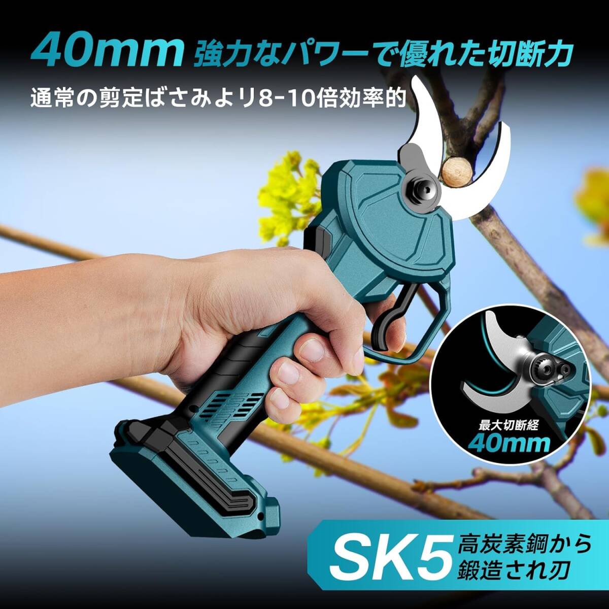 【ハイパワー電動剪定ばさみ 本体のみ|18Vバッテリー対応|最大切断径40mm|高枝切りポール接続可】 【簡単に40mmまで切断可能】 強力なブラシレスモーター搭載で、最大40mm径の枝をスムーズに切断。関節炎の方でもラクに操作できる軽量・滑り止め設計。 【高枝切り対応|ポール接続可能】 伸縮式延長ポール(別売)と接続し、高所剪定も対応。 250cmタイプ:こちら 150cm軽量タイプ:こちら 【本体のみ販売|18Vバッテリー対応】 バッテリー別売。本製品はマキタ18VバッテリーBL1820b/1830b/1840b/1850b/1860b)に対応。 【高品質SK5ブレード|ナイフ径切替】 日本製SK5高炭素鋼ブレード使用。 ナイフ開きサイズは10/15/25/40mmに切替可能。(電源ボタンのみで切替) 【LEDディスプレイ搭載】 バッテリー残量&カット数をリアルタイム表示。作業効率をサポート。 【安全保護機能付き】 起動は引き金を2回素早く引く設計で、誤作動防止。無操作1分で自動休止モードに移行。 ご注意 ・モード切替時は引き金を引かず、電源ボタンのみを押してください。 ・バッテリーと充電器は付属しておりません。 |