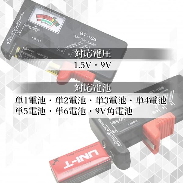 ・様々な乾電池の電池状態を測ることのできるバッテリーチェッカーです。 ・画面には赤、黄、緑の三色で残量を表示します。 ・赤が交換時期、黄が残量が残り少し、緑がまだ使用できますという風になっています。 【商品仕様】 カラー ブラック 対応電圧 1.5V,9V 対応電池種類 単1電池 ,単2電池 ,単3電池 ,単4電池 ,単5電池 ,単6電池,9V角電池