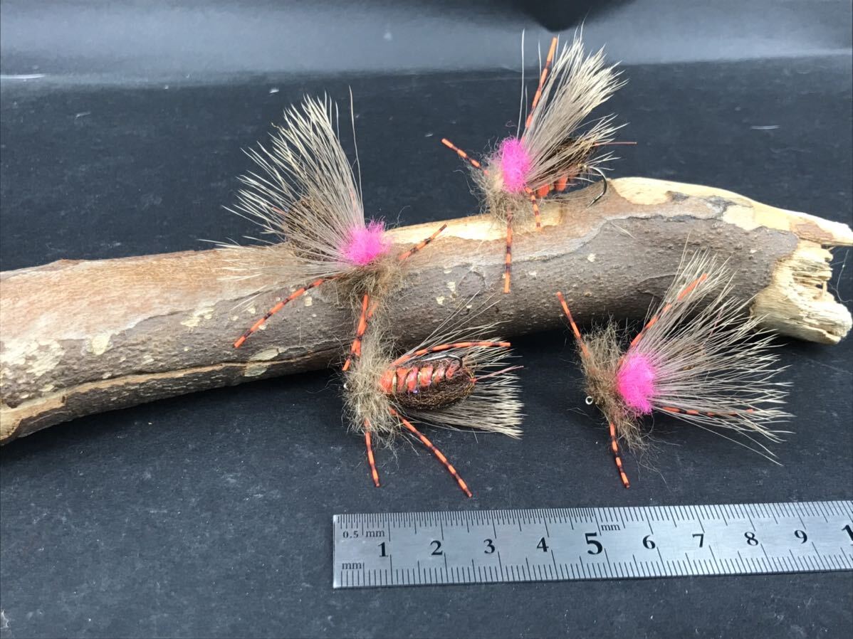 色々と拘りはあります。ボディ下巻きに秘密素材を巻いてます。マシュマロ部は色に拘り秘密素材を数種類混ぜ合わせています。マシュマロはよくエアロドライ系のマテリアルで作られたものが多いですがこちらはエアロドライ系は使用していません。レグにはこのフライの大きさに合う太さのラバーを使ってます。