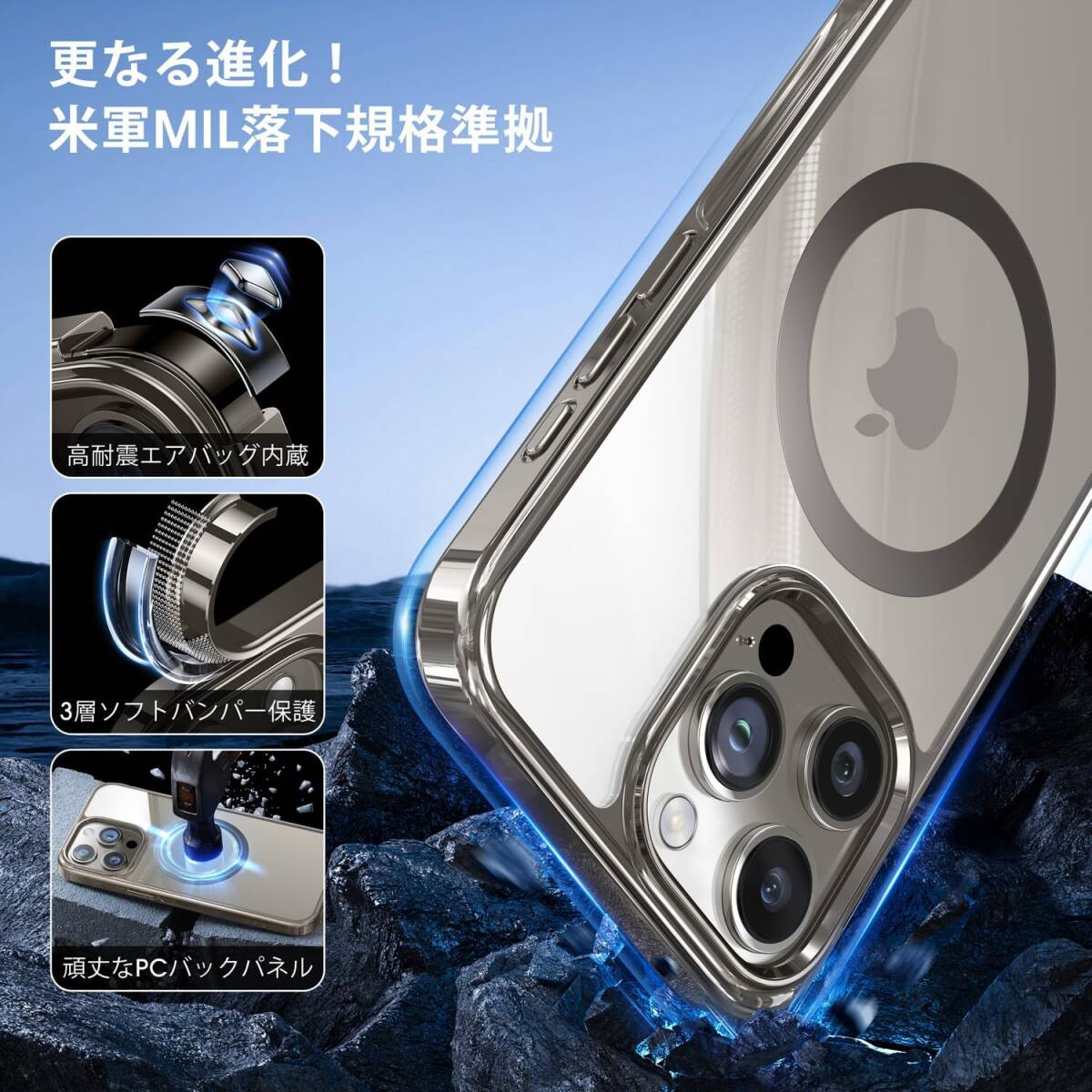 【途方もない耐久性】当社のiPhone 15 Pro 用ケースは、軽量でありながら耐久性のある高品質な素材で製造されております。透明なバックパネル素材は高い透明度を有し、美しいiPhoneロゴや綺麗なiPhone純正色を表示することができます。ハイパーな透明感を実現しながらも、変色しないメッキ加工・ハードPCパネルにより黄ばみや汚れに効果的に対抗します。また、頑丈なPCパネルが変形やクラックを効果的に防ぎます。厳しい傷つきテストにも耐え、長期間の使用を確保いたします。
