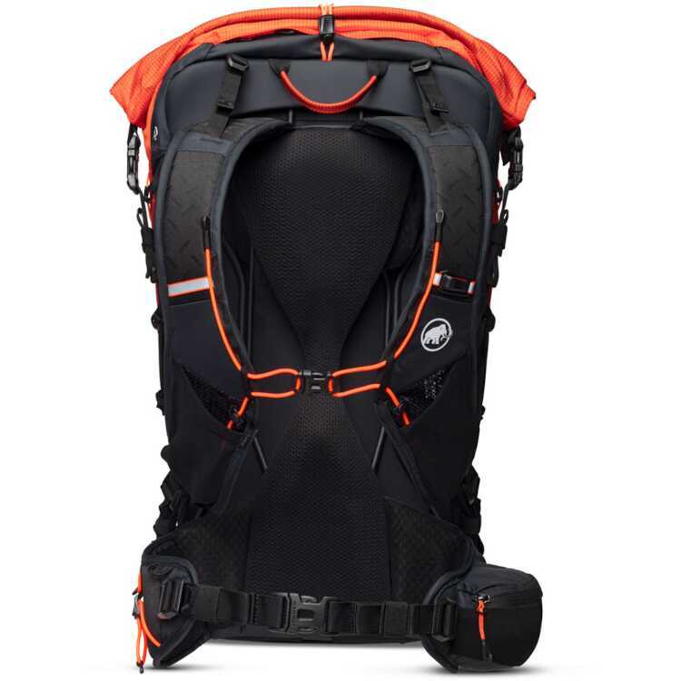 機能:背面システム/MammutActiveSpineTechnology、特許技術ActiveSpineTechnology採用のサスペンションシステム、撥水性ポケット伸縮性のあるチェストストラップ、一体型レインカバー、大きなメッシュポケット、ジッパー付きポケット、