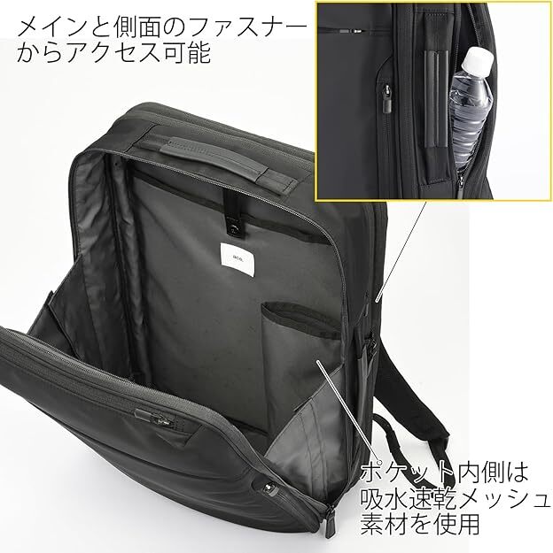 【機能一覧】: ■抗ウィルス・抗菌ポケット搭載:除菌グッズや財布などの収納に推奨。 ■フロントユーティリティポケット:傷が付きにくいようパイル生地を用いたメガネやサングラス等小物収納可能なポケット。 ■2WAYスルーポケット:側面ファスナーと本体気室の双方から物の出し入れが可能なポケット。 ■クイックラウンドポケット:身体の前に回した時も、小物が出し入れしやすいファスナーポケットを左右に装備し利き手に関係なく使いやすくなりました。 ■セミオートマチックスライダー:ファスナーの音が気になるというお声から、ファスナートップを固定することで音を制限するよう改良しました。 ■2気室:荷物の仕分け収納がしやすい2気室タイプ。 ■チェストベルト付きハーネス:体格の良い方や荷物が重たくなりがちな方に推奨のハーネスデザインで、肩からのズレ落ちを防ぐチェストベルトが付属しています。 ■リサイクル素材を採用:生産途中で出る廃繊維からできるナイロン原糸を使用した生地を採用し、地球環境に配慮しています。■容量拡張型:荷物の大きさや量が増えた際に容量を増やすことができるエキスパンダブル機能を搭載しています。