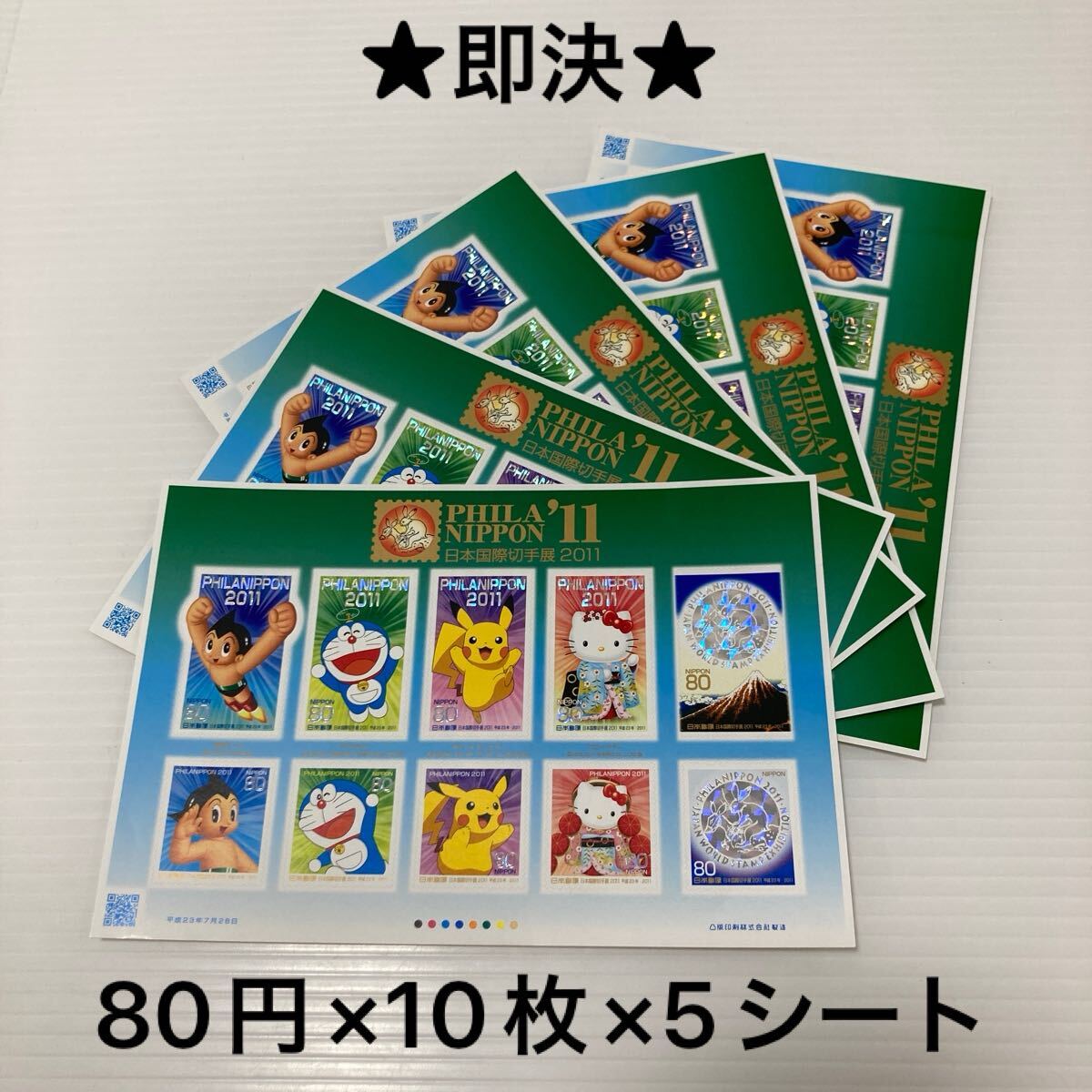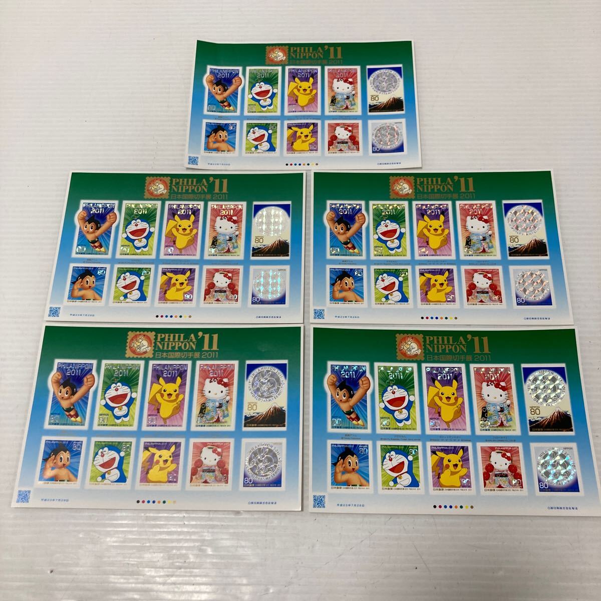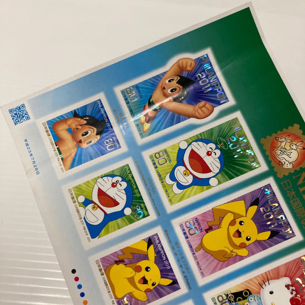 【即決】 切手 日本国際切手展 2011 鉄腕アトム ドラえもん ピカチュウ キティ 鳥獣人物戯画(葛飾北斎筆) ホログラム 80円×10枚×5シート