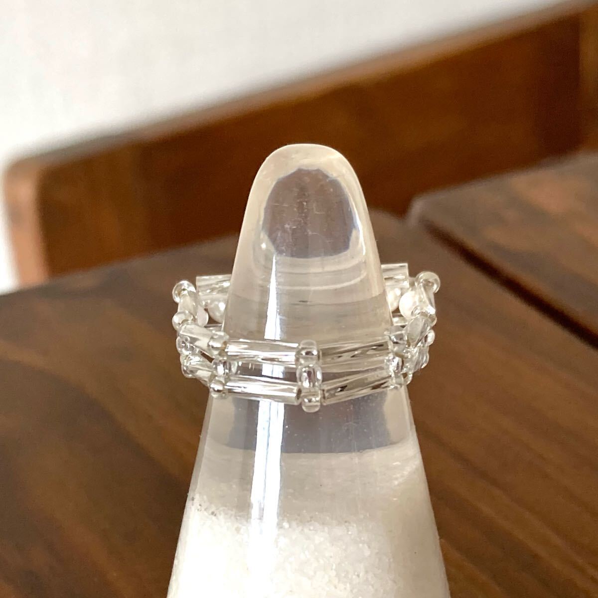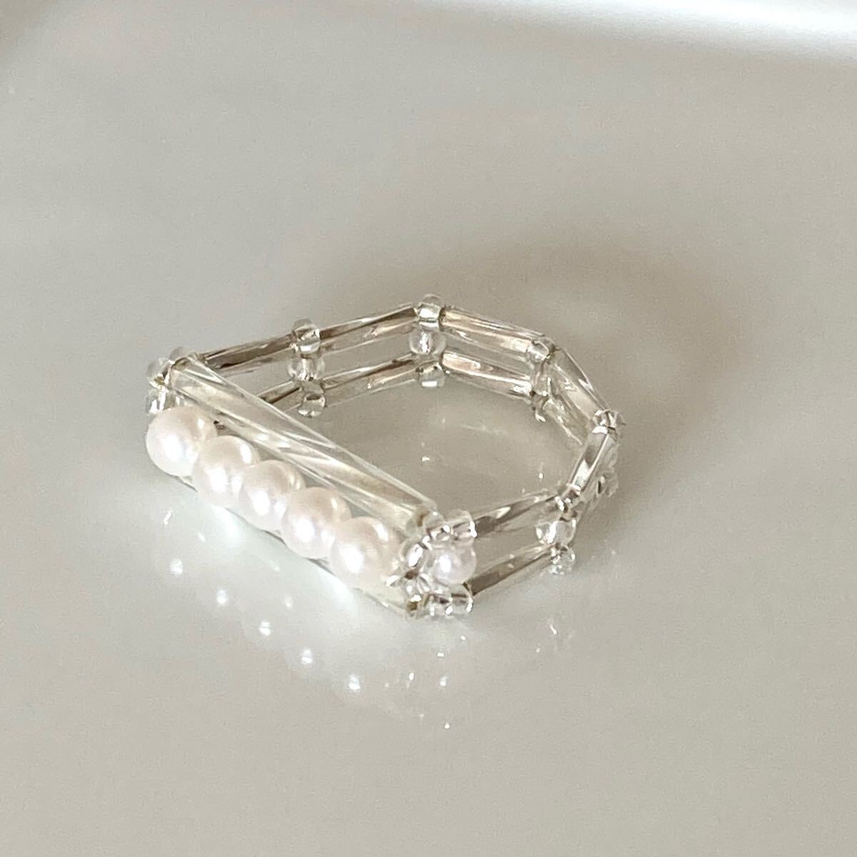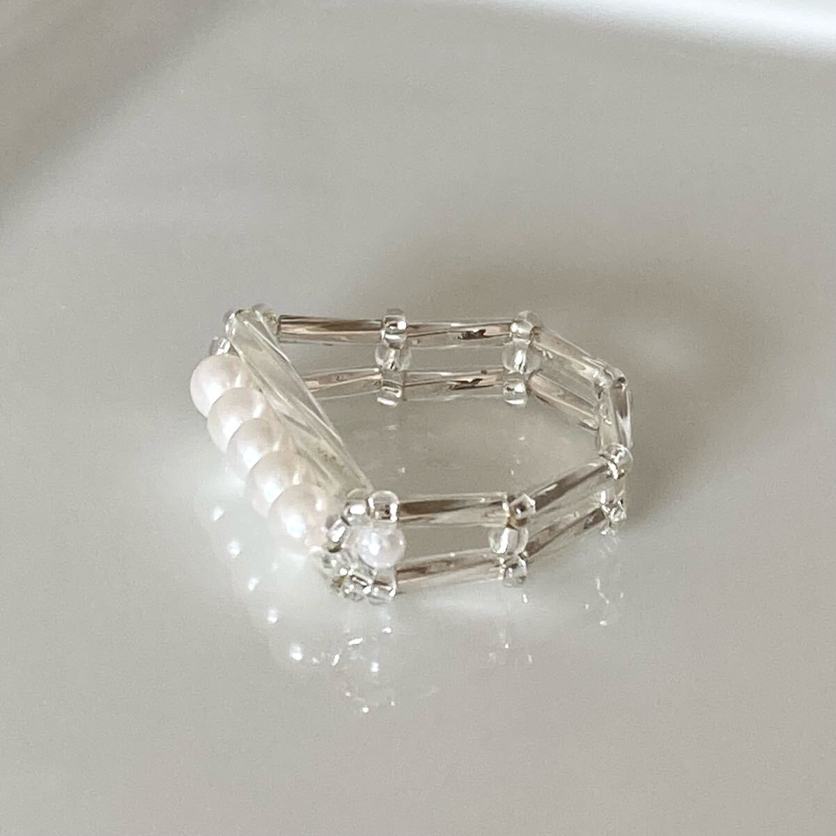20mmと6mmのシルバーのツイスト竹ビーズ、4mmの白のパールビーズ、クリアシルバーの丸小ビーズで作ったリングです。