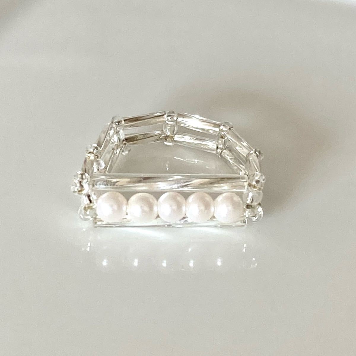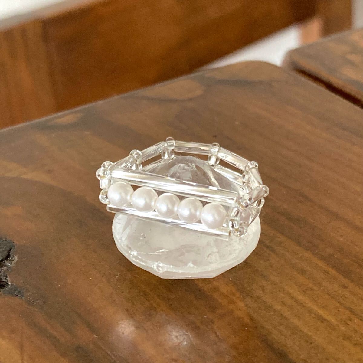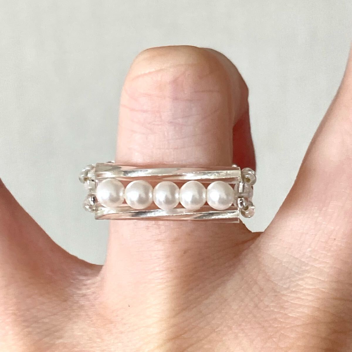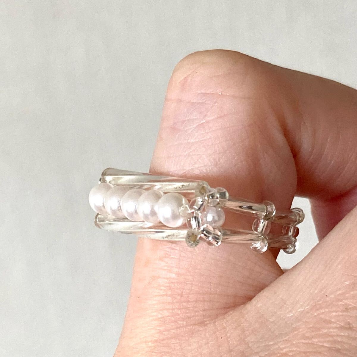 20mmと6mmのシルバーのツイスト竹ビーズ、4mmの白のパールビーズ、クリアシルバーの丸小ビーズで作ったリングです。