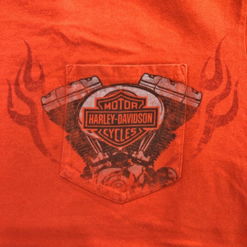 [商品管理番号] U0819 [ブランド] HARLEY DAVIDSON/ハーレーダビッドソン [サイズ] XL相当 [実寸サイズ] 肩幅:約55cm 着丈:約70cm 身幅:約61cm 袖丈:約21cm [主な素材] 表地 : コットン [色] オレンジ [仕様] モーターサイクル [状態] 汚れ:腹部 特記事項:色褪せ、タグ欠損、プリント劣化 | |||