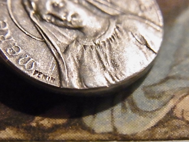 有名なメダイ彫刻家一家PENINの三代目のデザインで表面左下に刻印があります。