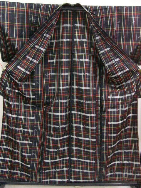 リサイクル品 黒色地格子模様 正絹平織り紬ひとえ着物 USED美品