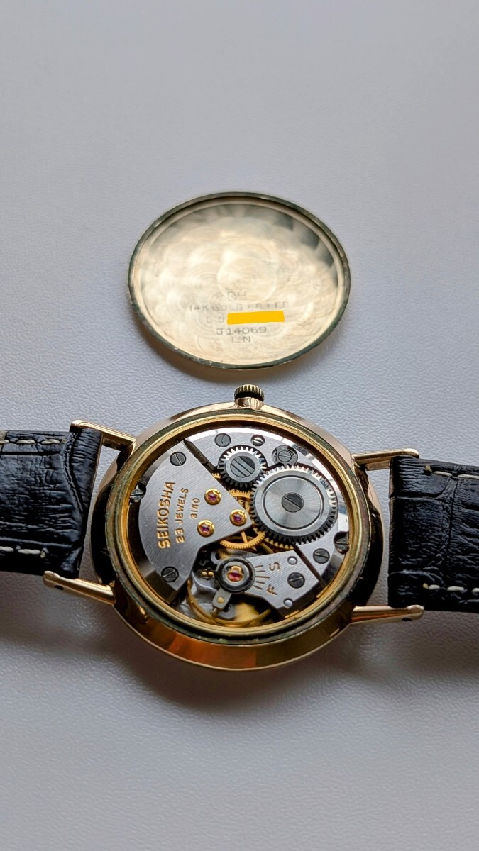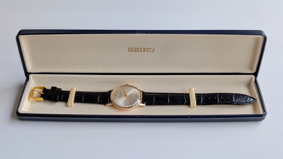 薄型設計の限界に成功した国産高級モデルでセイコーマーベルをベースに薄型化・耐震装置等のアップデートされたモデルです。当時の流行りであった“大きな文字盤の薄型時計”の高級機になっております。