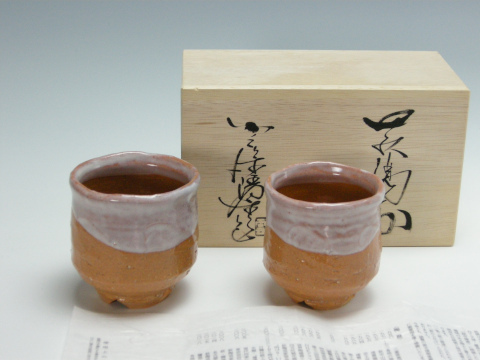 萩焼 小久保凌雲 作 萩掛分夫婦湯呑(琵琶)