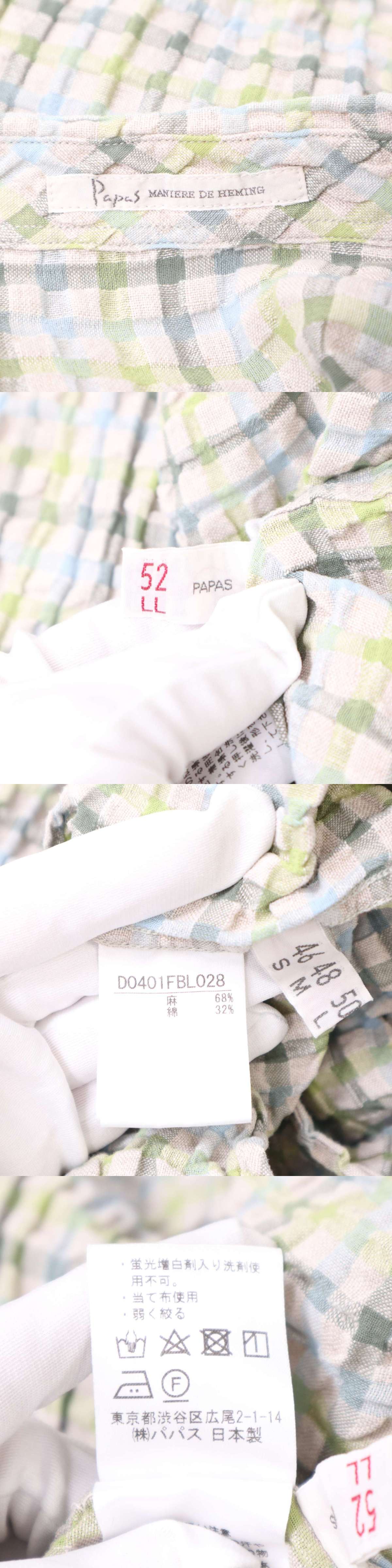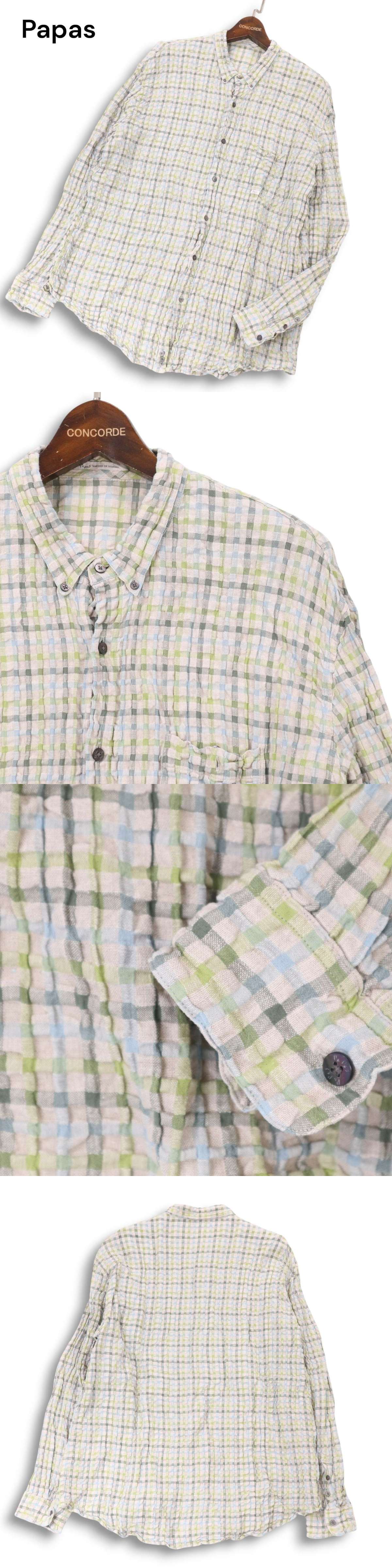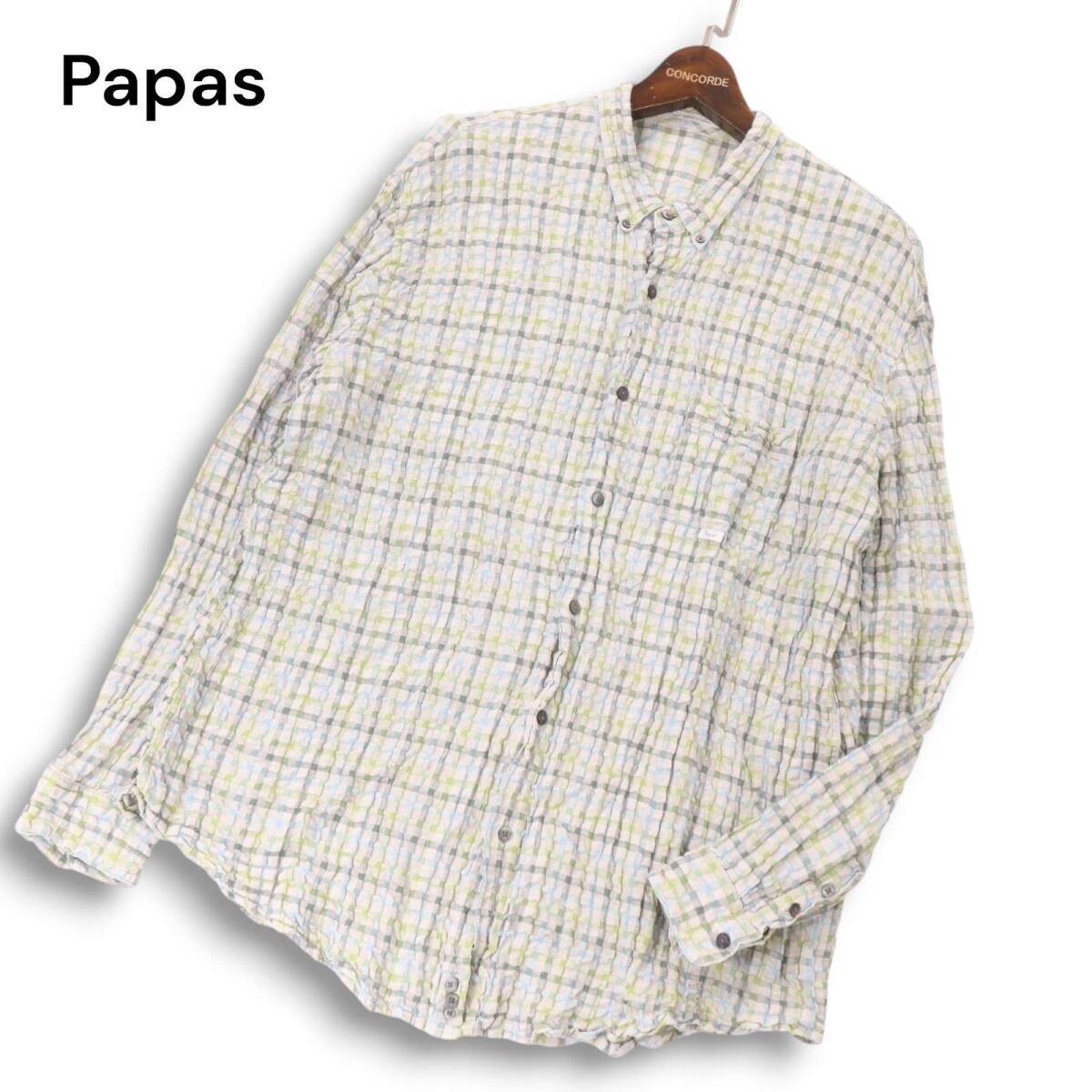 Papas パパス 春夏 ゆったり★ ボタンダウン 長袖 リネン サッカー チェック シャツ Sz.LL メンズ 日本製 大きいサイズ