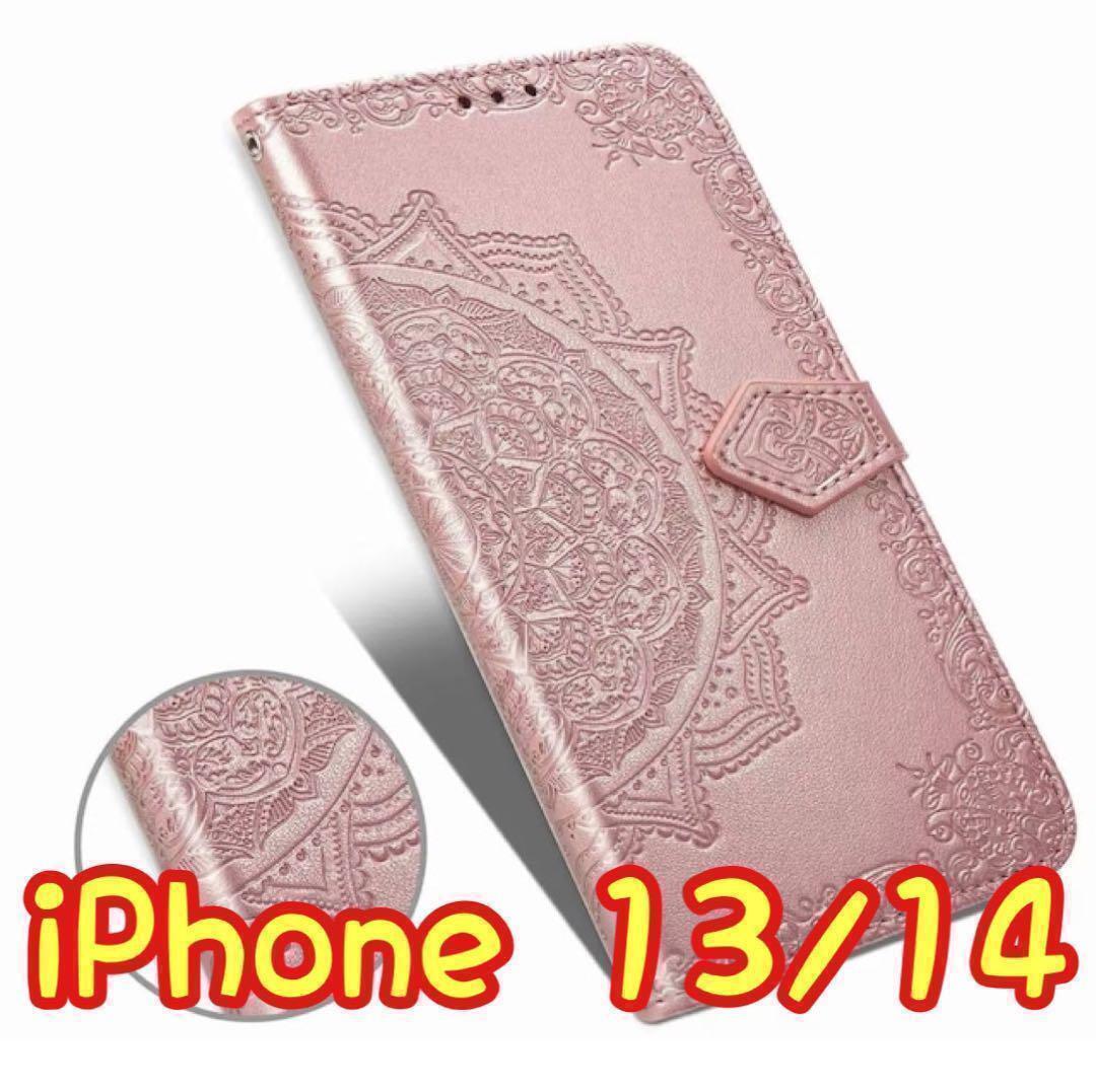 エンボス加工スマホケース 手帳型 iPhone13/14 ピンク