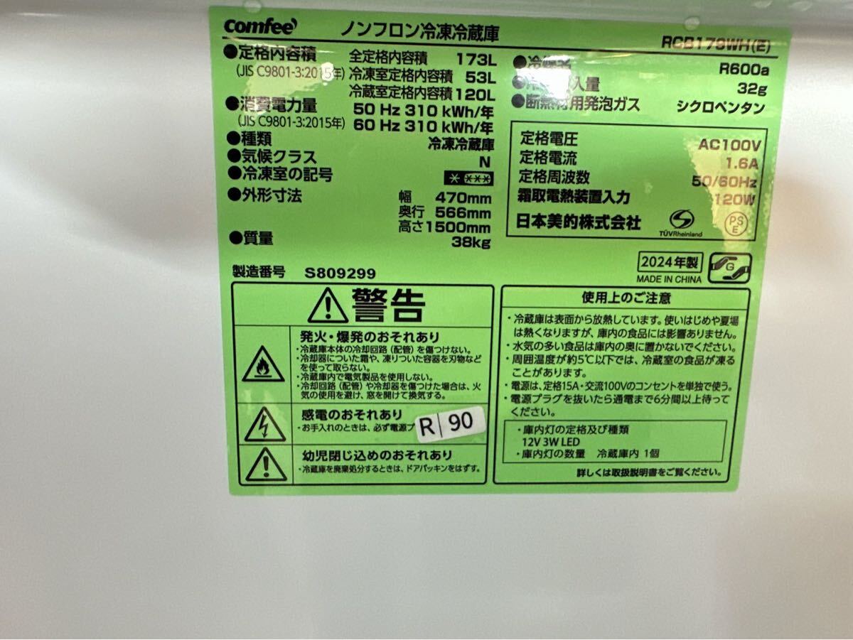 大阪送料無料★3か月保障付き★冷蔵庫★コンフィー★2ドア★2024年★RCB179WH★R-90