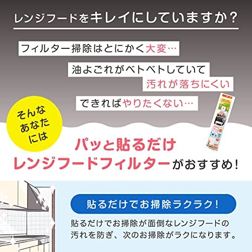 商品紹介●ふんわりフィルターが油汚れをしっかりキャッチします! ●のり残りしにくい粘着タイプのフィルターなので、取付けがシールのように簡単・キレイに行えます。●フィルターが汚れたら交換お知らせサインが浮き出るので、取替え時期が一目でわかります。ご注意(免責)>必ずお読みください●料理にブランデー・日本酒・みりん等のアルコール類を入れ、炎が高く上がる可能性がある場合にはご使用しないでください。●レンジフードの形状により取付できない機種があります。●直接、火の当たる場所では使用しないでください。 ■ご注文からお届けまで ※トラブル防止のため入札、落札前に必ずご一読をお願い致します。 落札後のお客様都合でのキャンセルはお受けできませんので、予めご了承ください。 1.ご注文 : ご注文は24時間受け付けております。 2.注文確認 : ご注文時、オーダーフォーム等必要事項を入力お願い致します。 3.入金確認 : 前払い決済をご選択の場合、ご入金確認後、配送手配を致します。 4.出荷 : 配送準備が整い次第、出荷致します。配送業者、追跡番号等の詳細をご連絡致します。 5.到着 : 出荷後、1-3日で商品が到着します。 ※商品の到着までは、決済確認後、3-7営業日でお届けとなります。 ※離島、北海道、九州、沖縄は遅れる場合がございます。ご了承下さい。 ※代引の場合、手数料として660円頂きます。 商品管理、在庫管理は行っておりますが、商品の不具合等でお届け出来ない場合は、 銀行口座へ振込返金となりますので、予めご了承いただきますようお願い申し上げます。 手続き削減の為、こちらからは発送完了までご連絡を行なっておりません。 原則、電話対応はしておりませんので、ご質問等はお問い合わせ、またはメールにてお願い致します。 土日祝祭日はご質問や落札されても商品発送等の、対応ができない日もございます。 予めご了承ください。 | ||