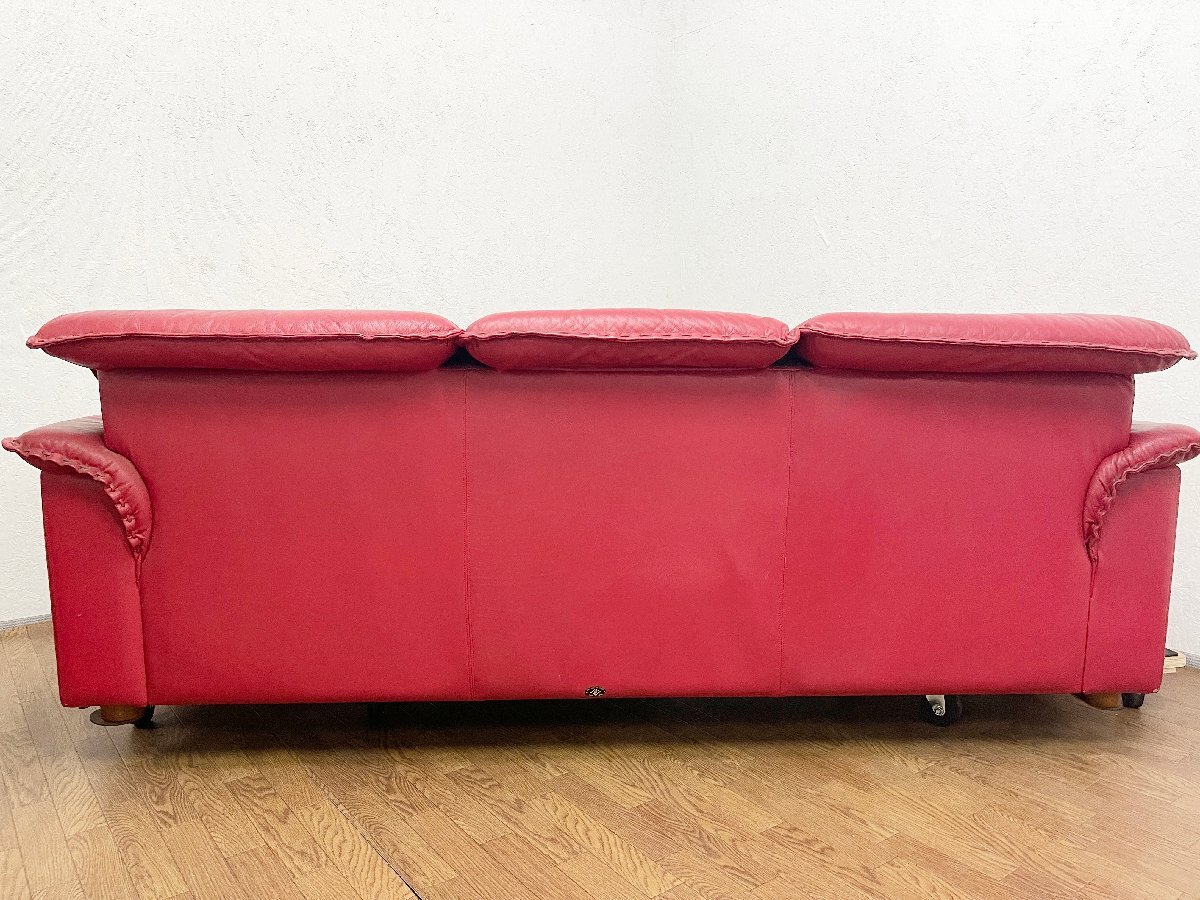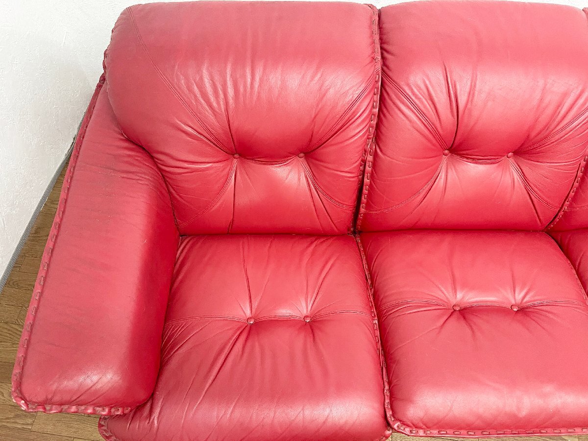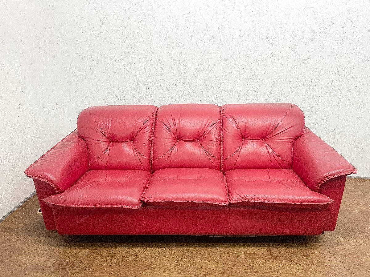 ◆富士ファニチア 3人掛けソファ 本革 3P ヴィンテージ トリプルソファ 腰掛 アームソファ 赤 レッド 家具 インテリア 応接椅子 (貝1100)