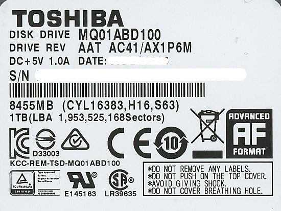 TOSHIBA(東芝) ノート用HDD 2.5inch MQ01ABD100 1TB 500~1000時間以内 | |