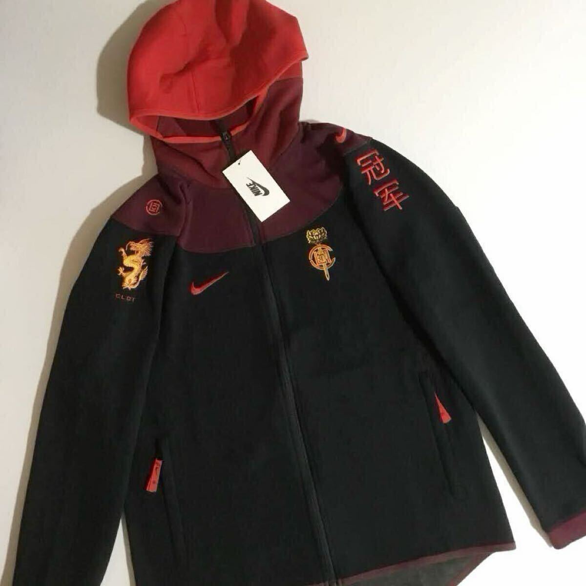 コートの外で着るドラゴンのデザイン。CLOTの創始者でありデザイナーであるエディソン・チャンが、レプリカのバスケットボールギアからヒントを得て生み出したナイキ x クロット パーカー。暖かく快適で、いつでもプレー準備万端です。