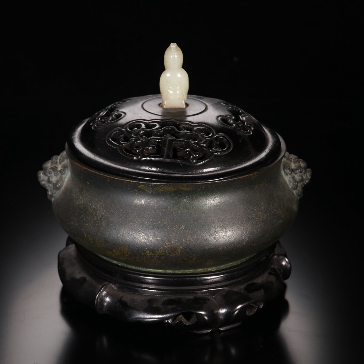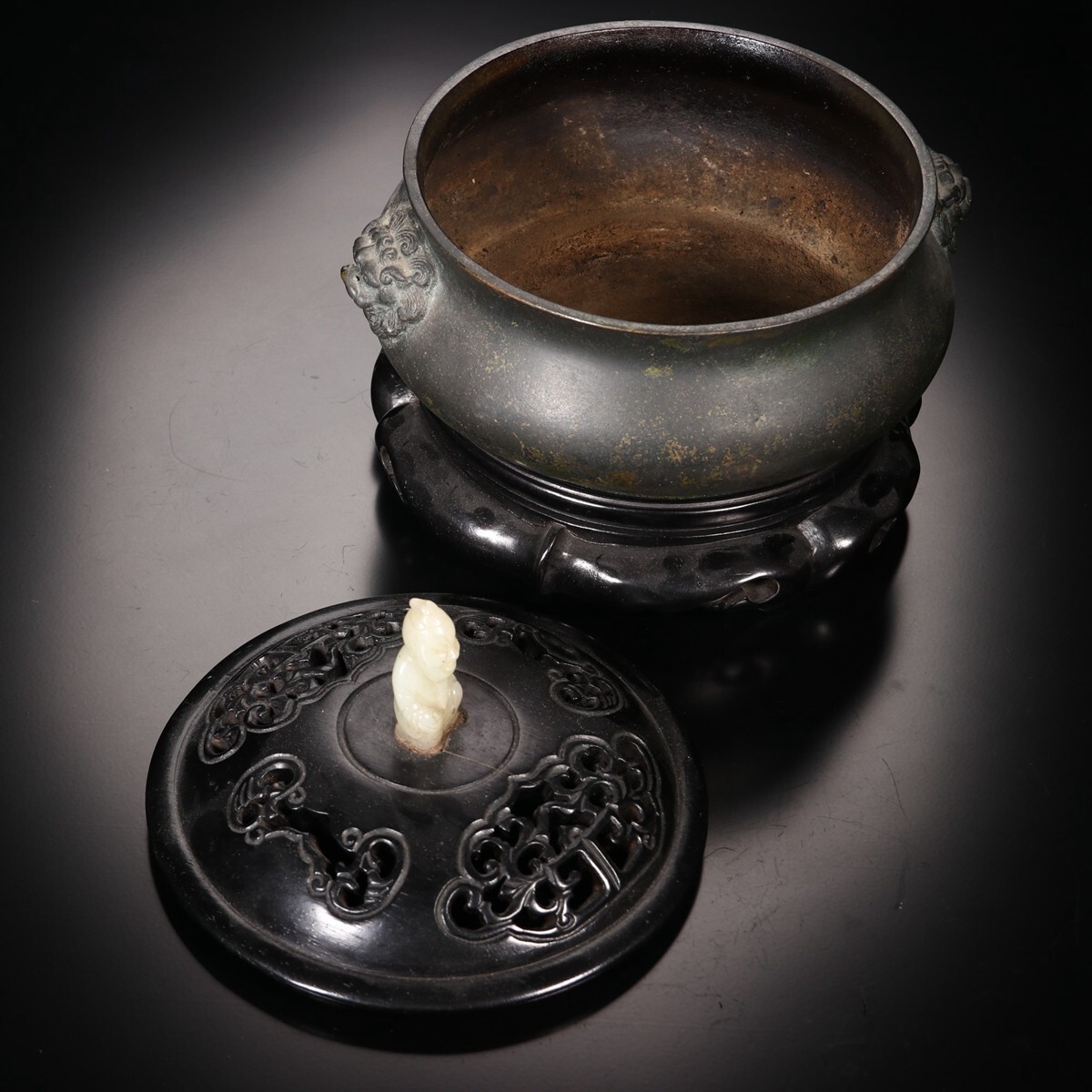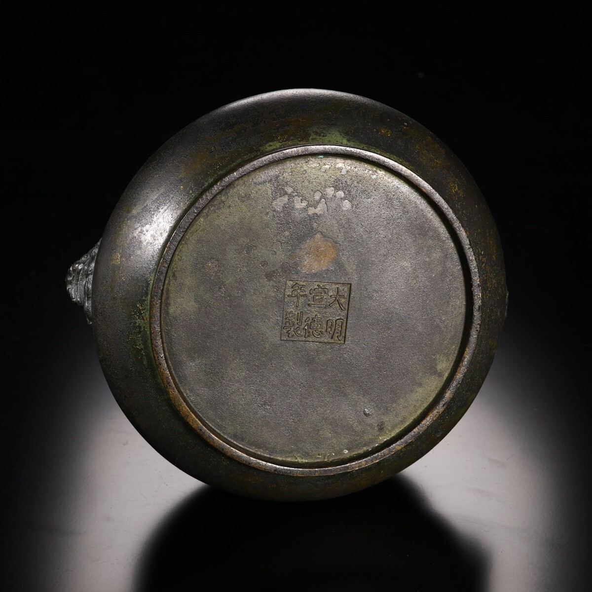 「明代 大明宣徳年製 古銅彫 獣面耳老銅香薰炉」旧銅器 置物擺件 賞物 中国古美術 旧蔵出