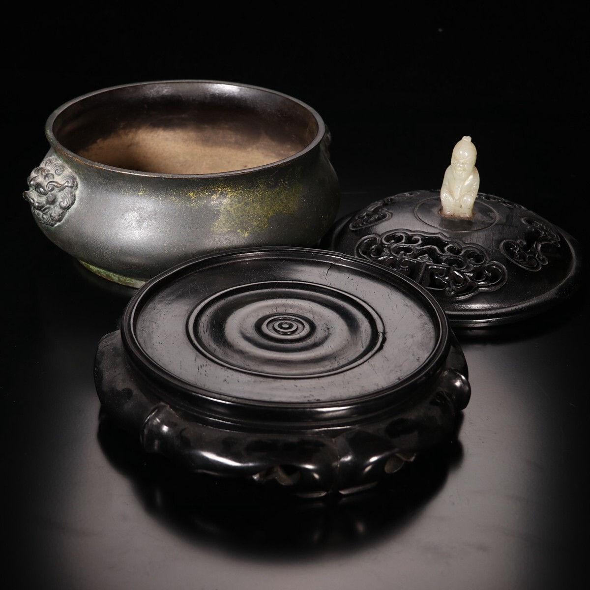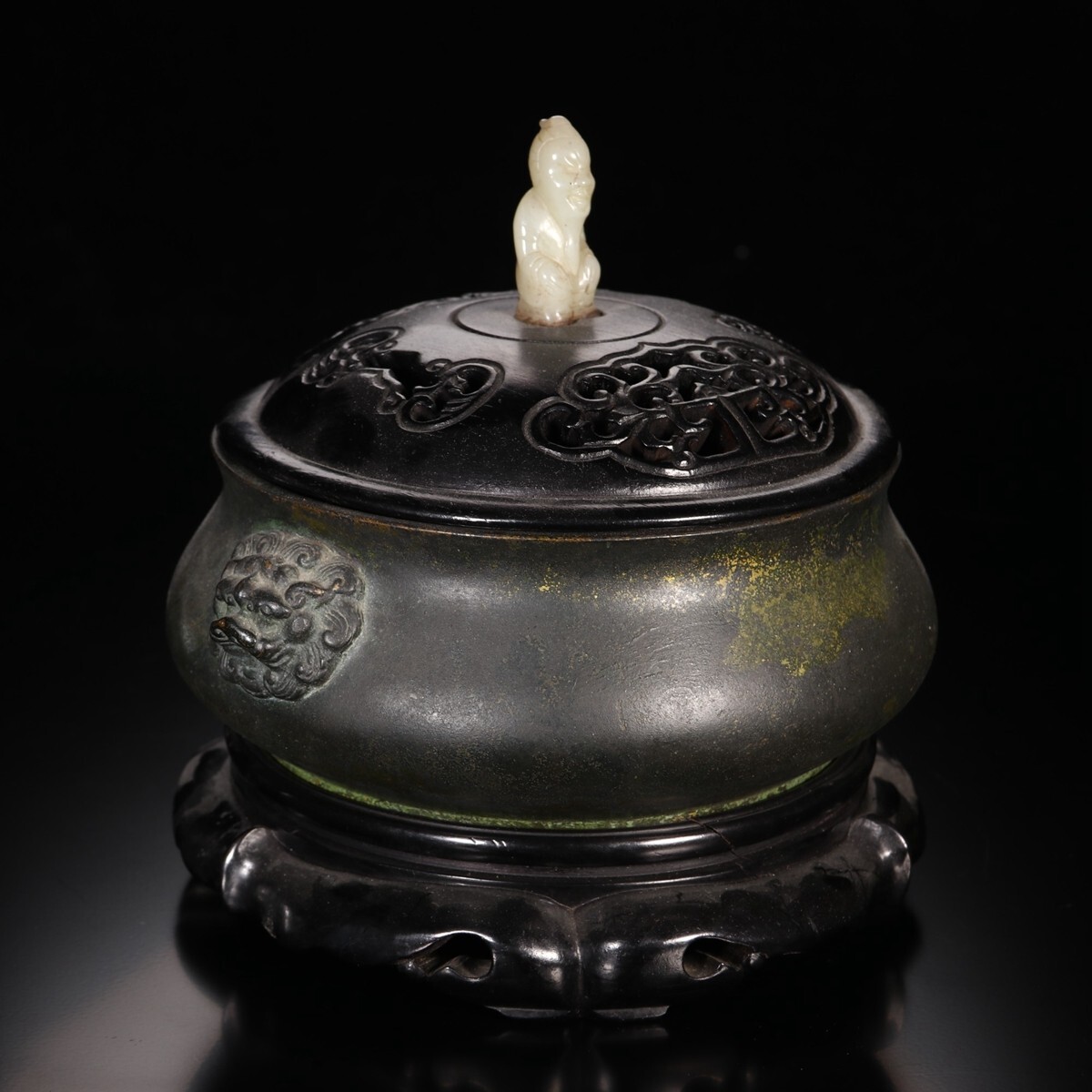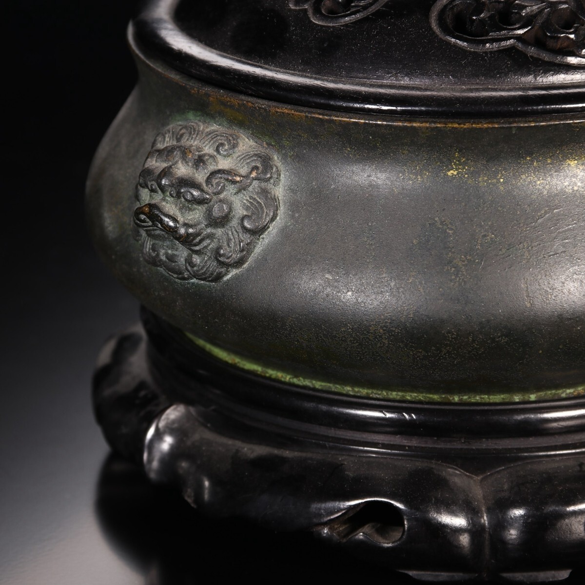 「明代 大明宣徳年製 古銅彫 獣面耳老銅香薰炉」旧銅器 置物擺件 賞物 中国古美術 旧蔵出