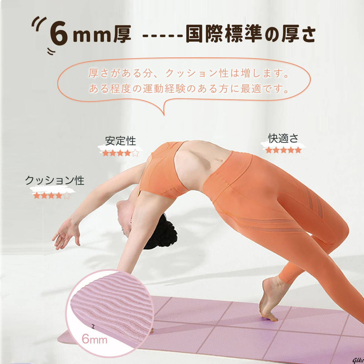 厚さ6mmのクッション性に優れ、膝や腕の負担を和らげながら安定したポーズをサポートします。