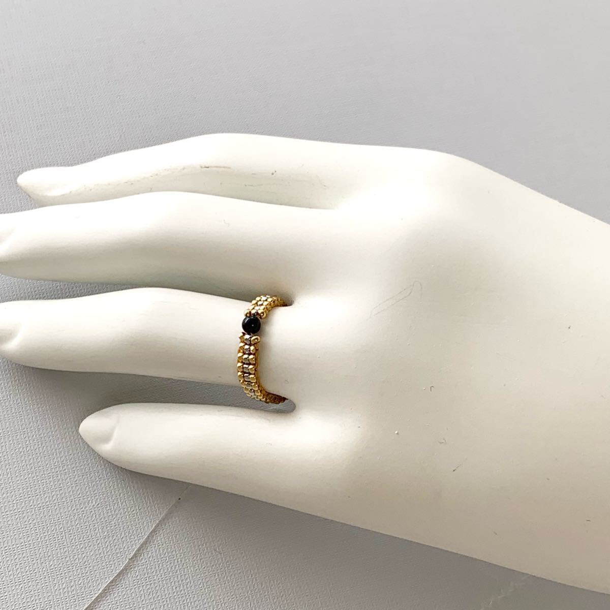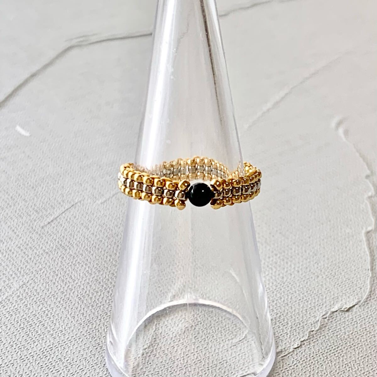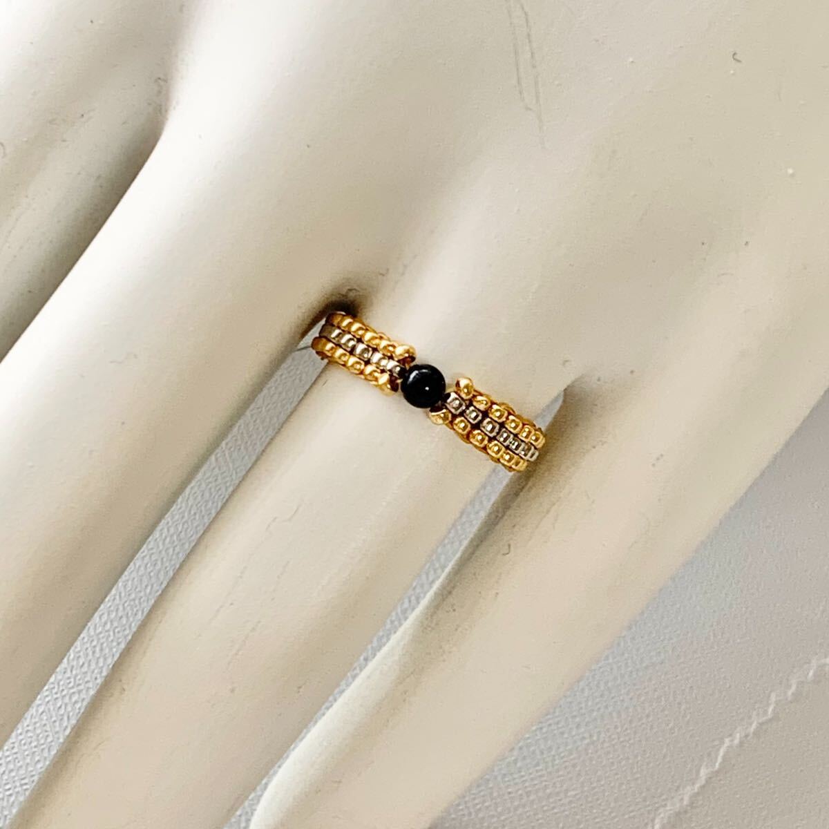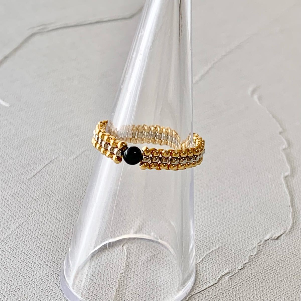 ゴールドとシルバーのビーズを丁寧に編み込み、中央には3㎜の天然石をあしらったハンドメイドのビーズリングです。シックなオニキスがアクセント!普段使いしやすいデザインは、お手持ちのリングと重ね付けしたり、気分に合わせてお使いいただけます。手元を華やかに彩り、コーディネートのアクセントになること間違いなし♪