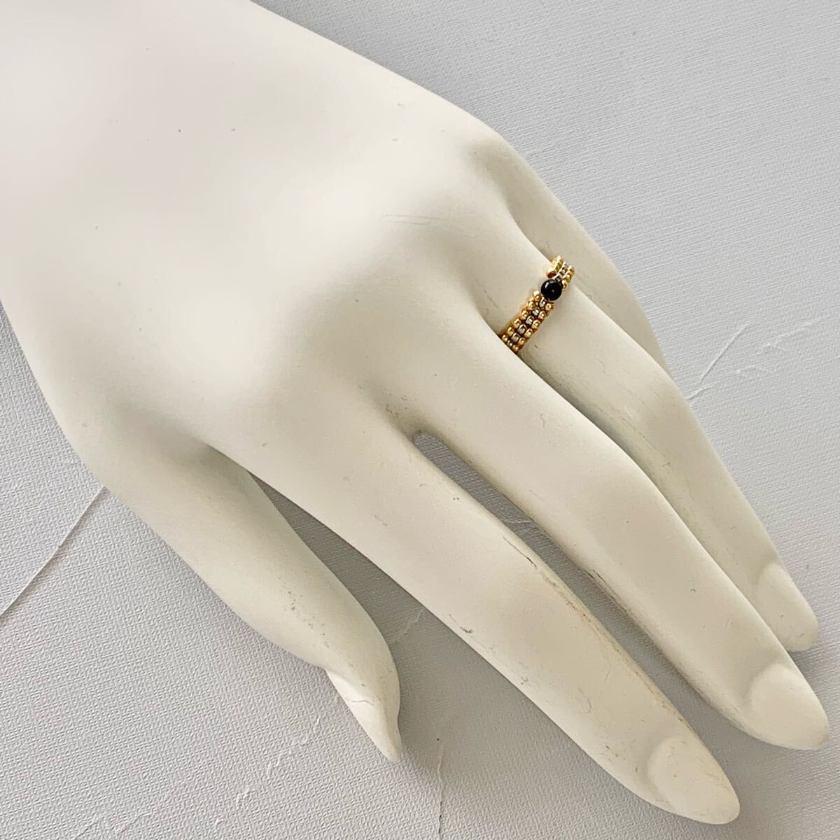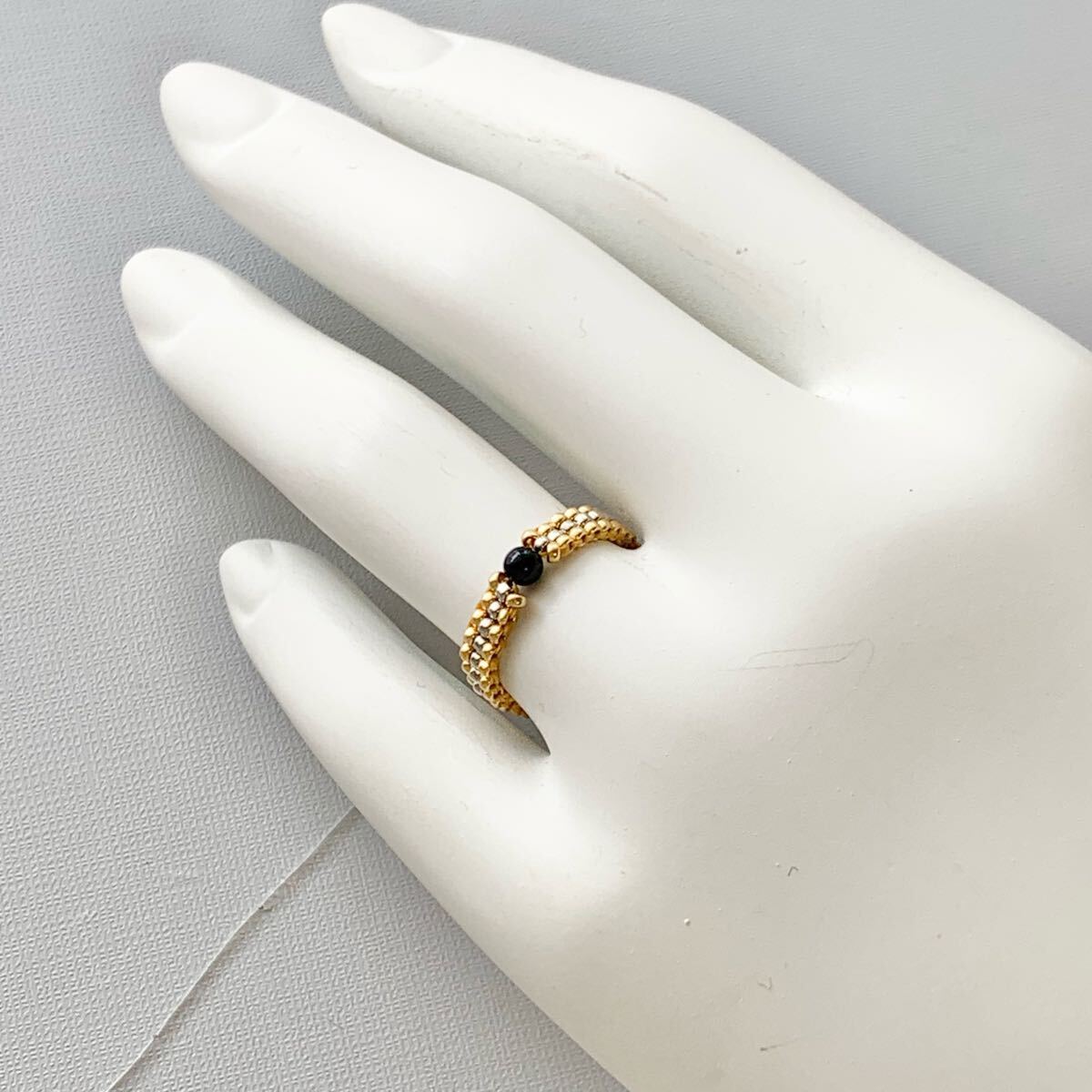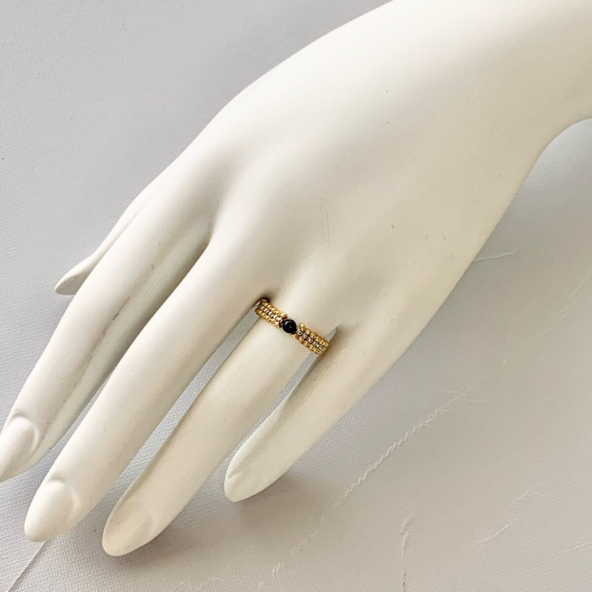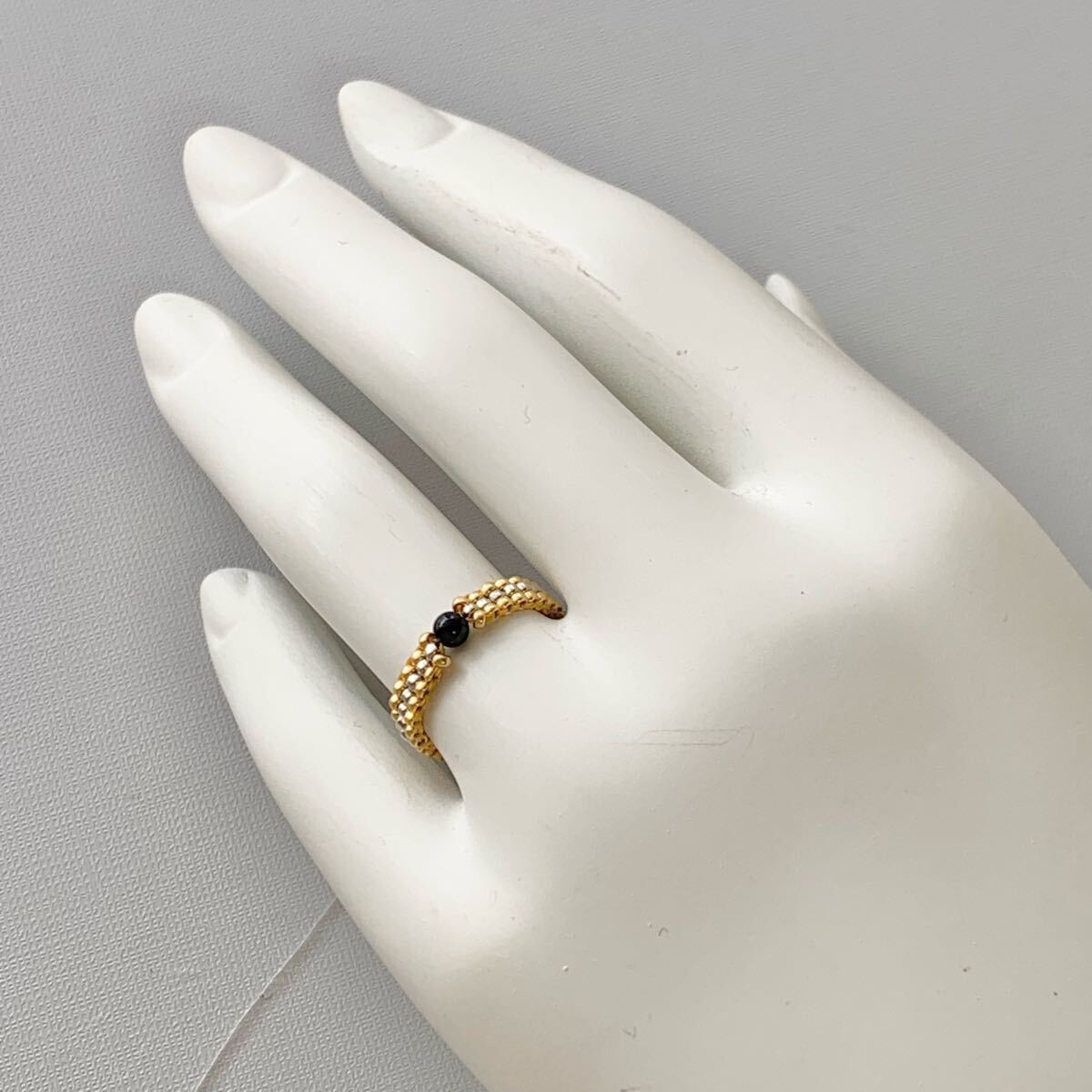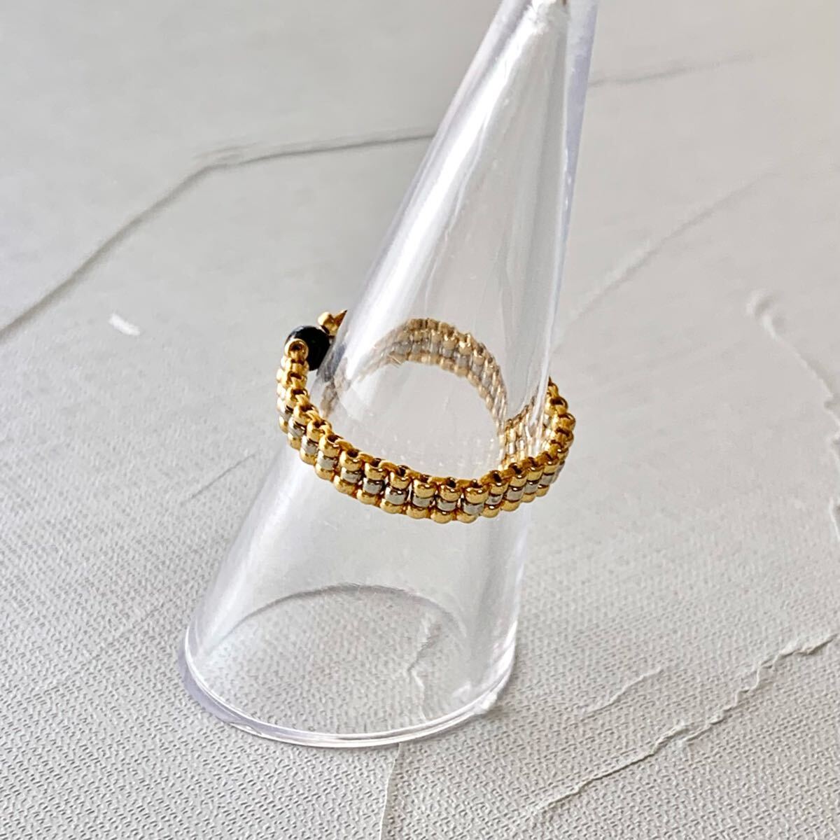 ゴールドとシルバーのビーズを丁寧に編み込み、中央には3㎜の天然石をあしらったハンドメイドのビーズリングです。シックなオニキスがアクセント!普段使いしやすいデザインは、お手持ちのリングと重ね付けしたり、気分に合わせてお使いいただけます。手元を華やかに彩り、コーディネートのアクセントになること間違いなし♪