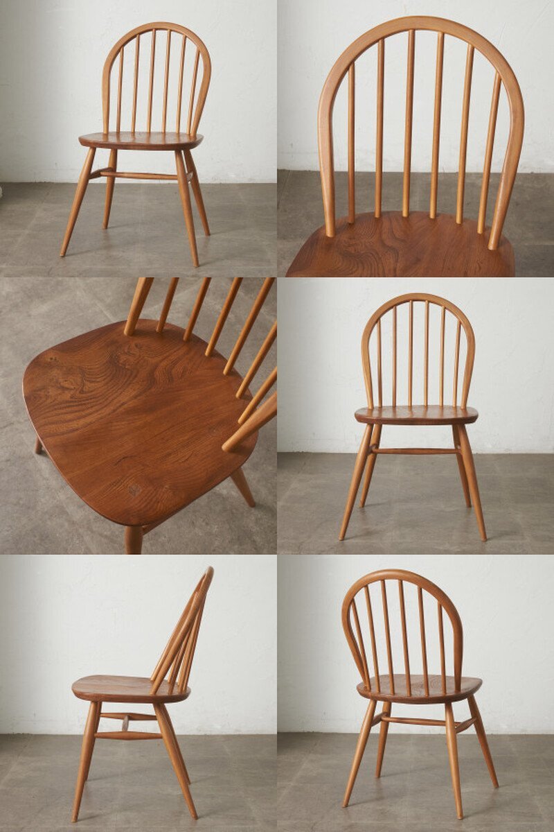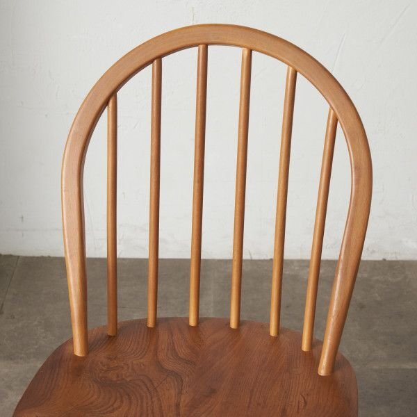 ERCOLのアイコン的存在であるウィンザーチェアシリーズの中で、最もオーソドックスなスタイルのフープバックチェアは「ボウバック(弓型の背もたれ)」という、クラシカルなデザインをベースに作られています。様々なバージョンがあり、背もたれのスポーク数が4本、5本、6本の3タイプ、座面はノーマル型とバイオリン型の2タイプ、大きさはノーマルサイズとラージサイズがあり、さらに6本スポークのチェアにはストレートレッグやアーム付きなどが存在し、その種類の豊富さもコレクター心をくすぐる大きな魅力となっています。